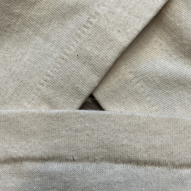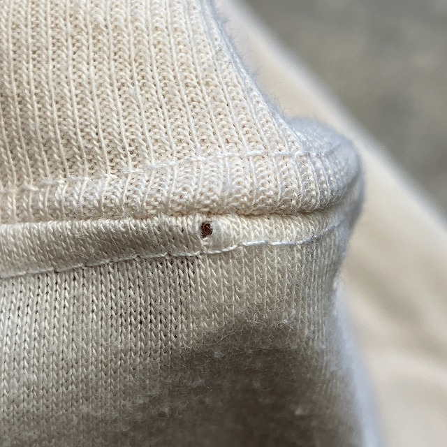 - 全体的に毛羽立ちがみられます。また、裾に小さなステッチ抜け、襟リブに小穴がみられます。その他、年代相応の着用感はございますが、ユーズド慣れされた方でしたら、まだまだ問題なく着用していただけます。