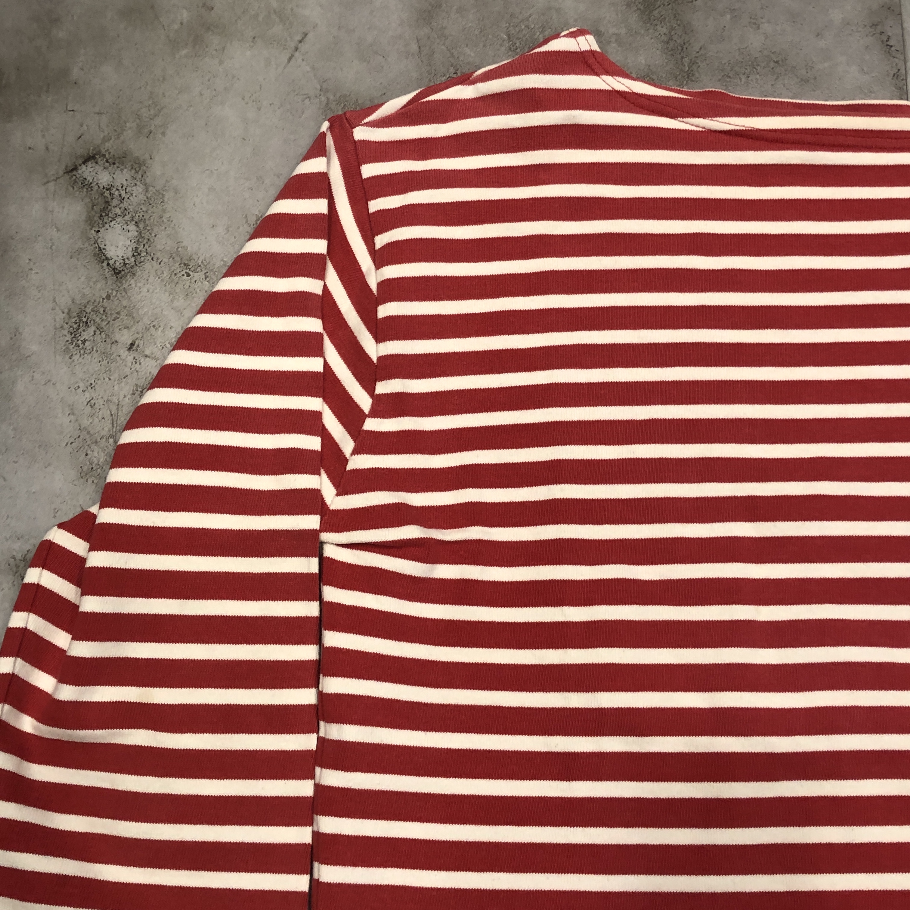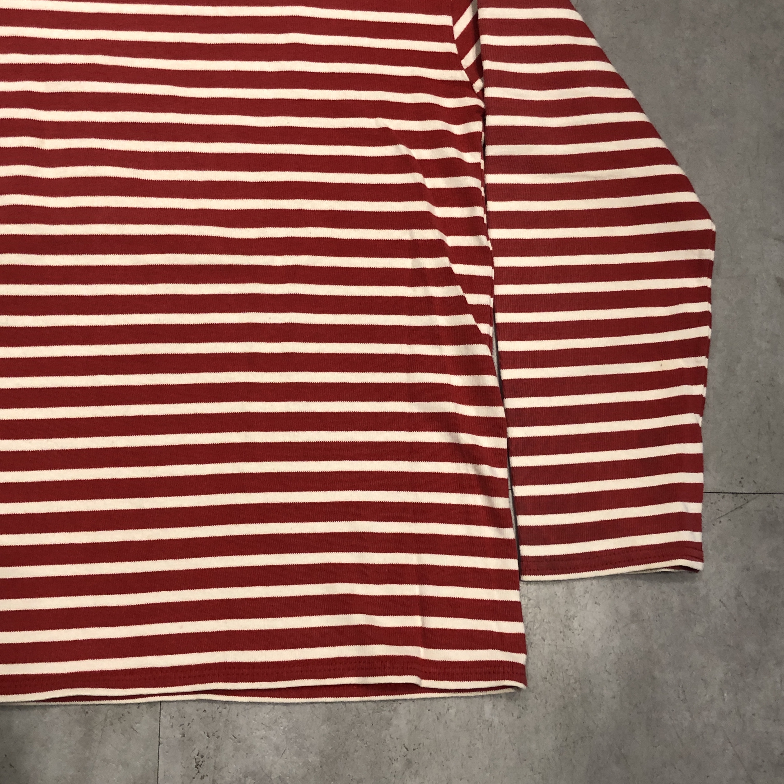 今回ご紹介するのは永遠の定番、レッド/ ホワイトのボーダーカラー。ミリタリーやワークスタイルにも馴染み、カジュアルからシックまで幅広く対応します。素材は100%コットンの目の詰まった天竺生地。着始めはしっかりとした張り感があり、洗い込むことで徐々に柔らかく、肌馴染みの良い風合いへと育っていきます。