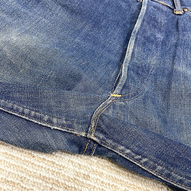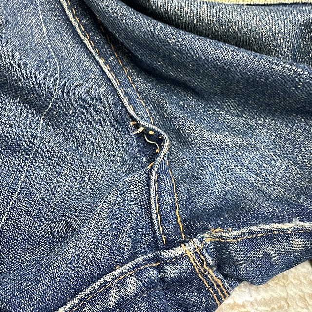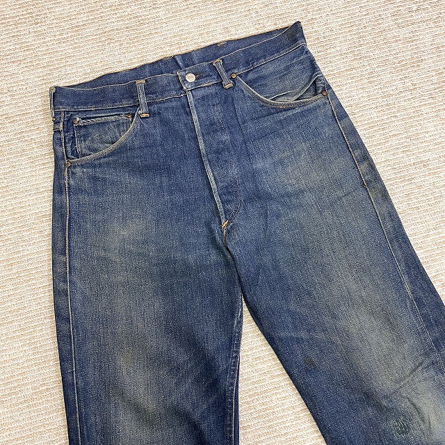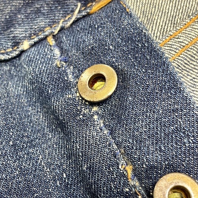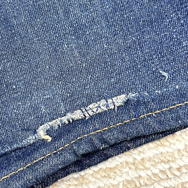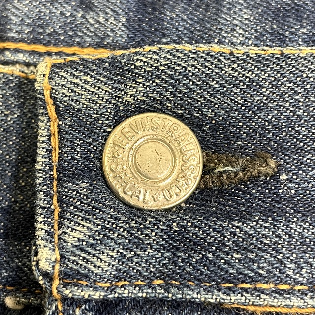 トップボタンが「LEVI'S」のボタンに交換されており、前左膝付近や右裾などにリペアがございます。