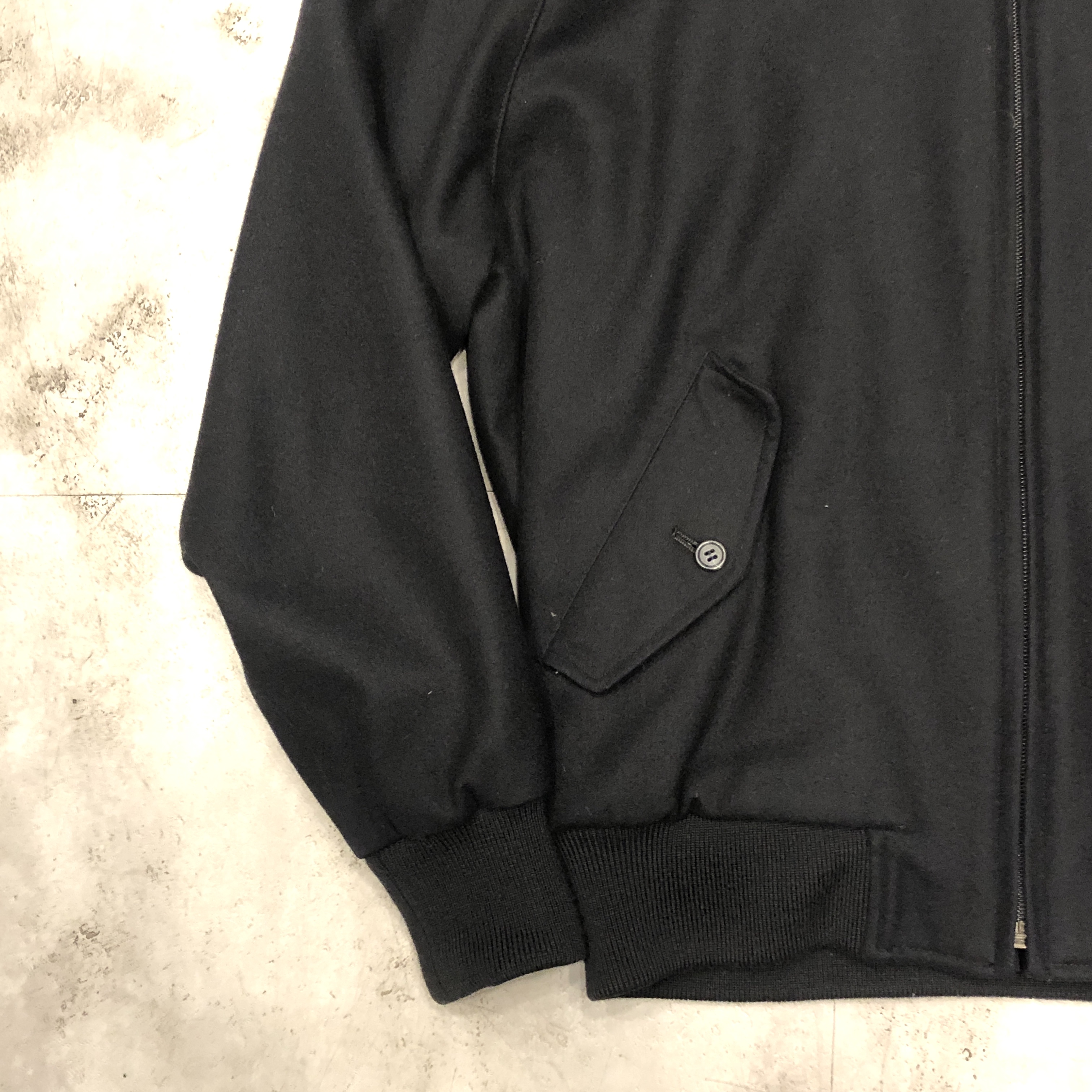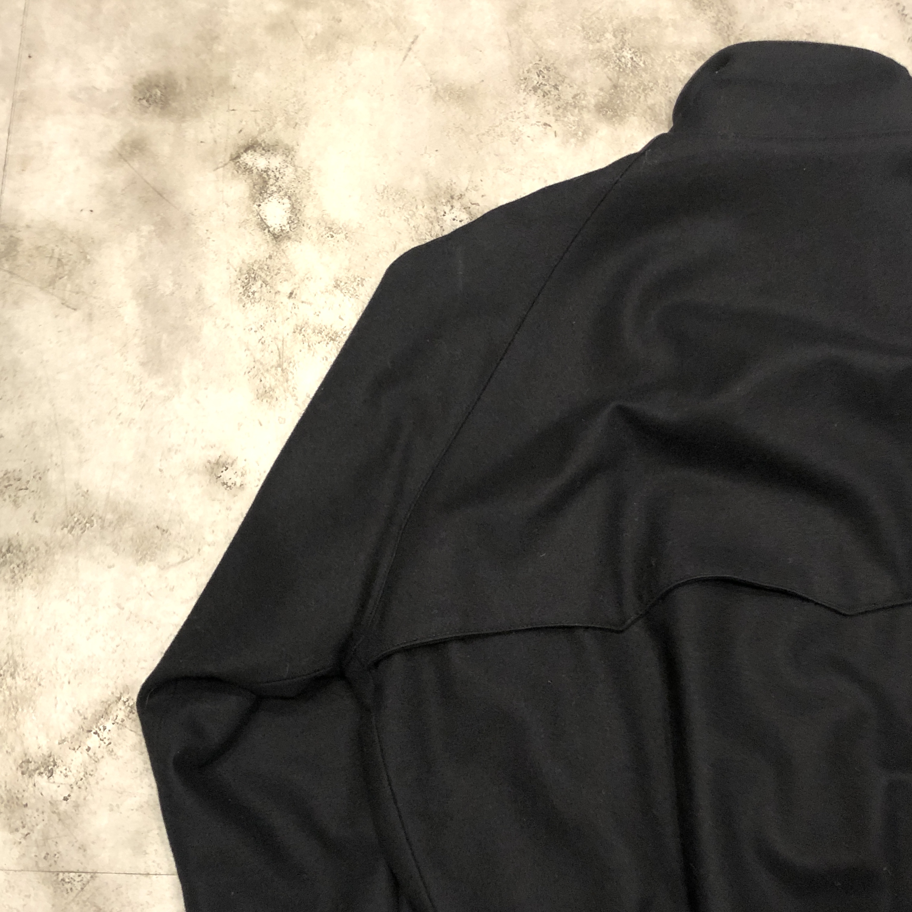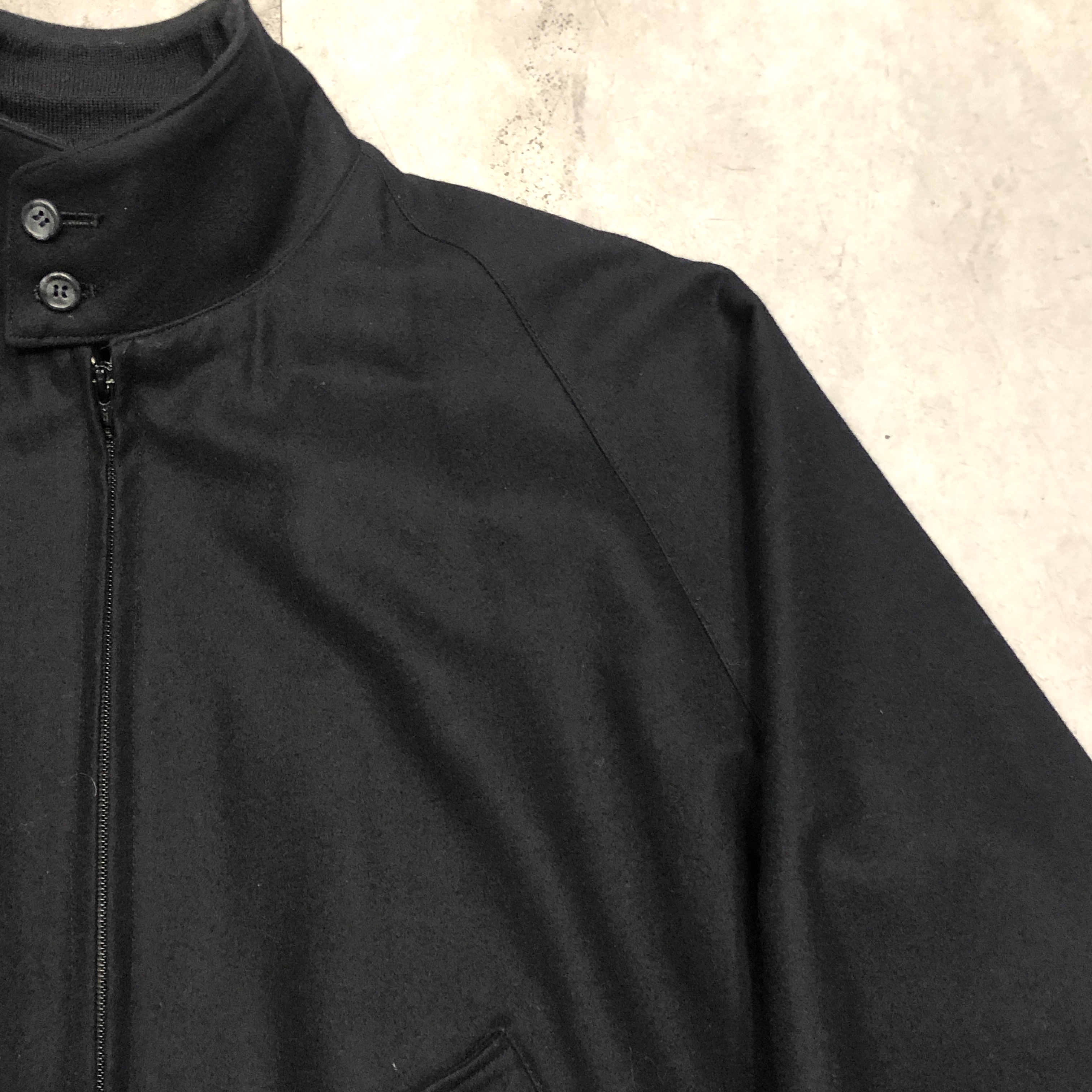 ベースはクラシックなハリントンジャケット。G-9型を踏襲しつつも、こちらはコットンではなくウール主体のファブリックを採用。表記はウール90%・ナイロン10%。しっかりとした肉感がありながらも滑らかで、どこか上品な光沢を感じる生地です。ネイビーというカラーも相まって、非常に落ち着いた大人の佇まいに仕上がっています。