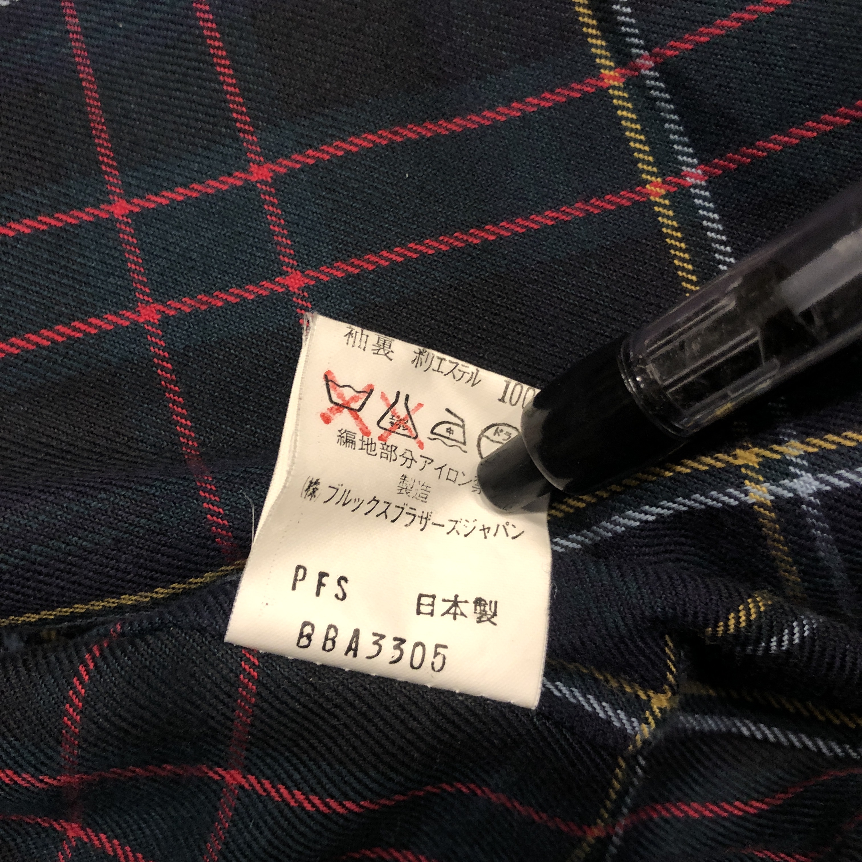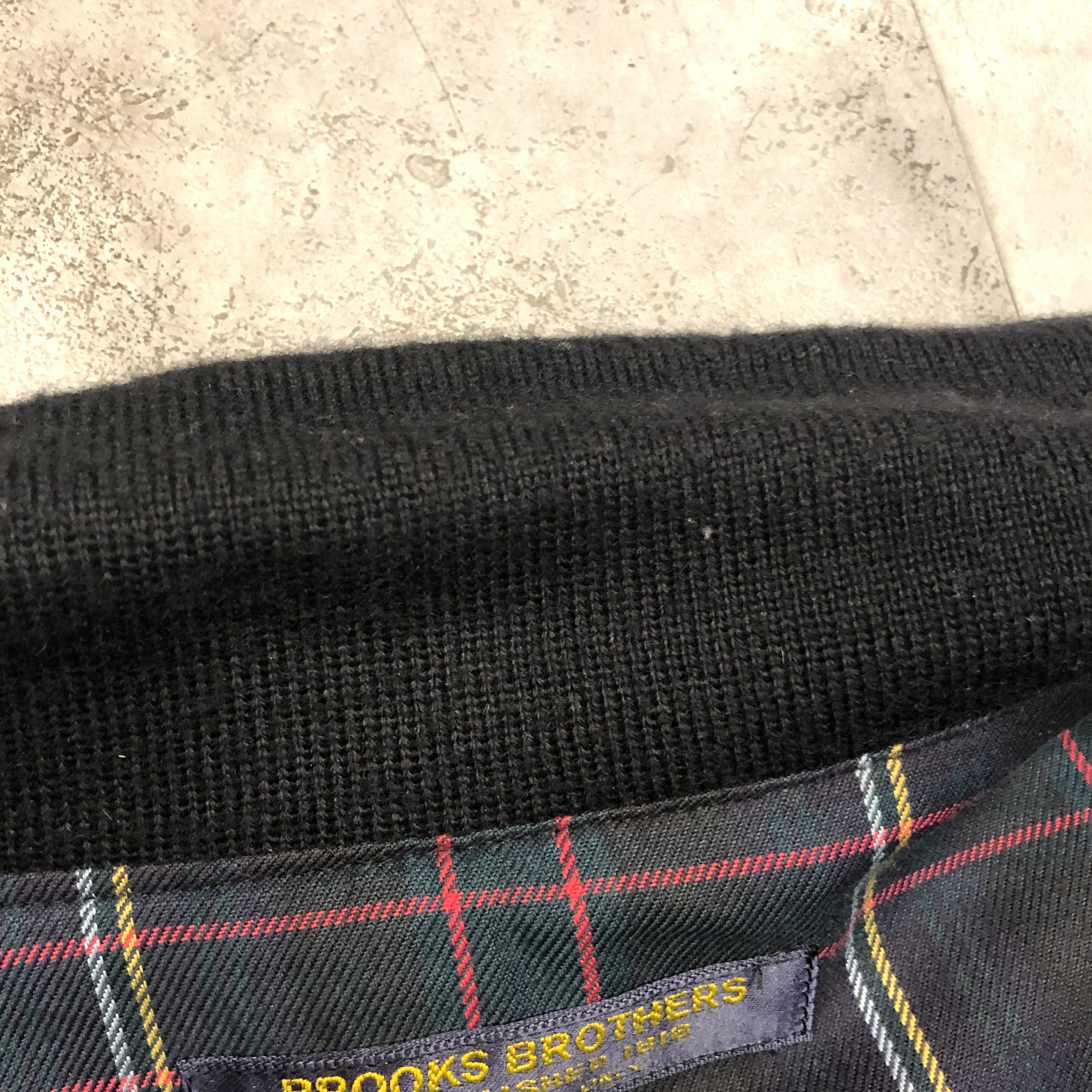 裏地にはトラッドらしいタータンチェック。ネイビーベースにレッドとイエローが走る配色で、脱いだ時にしっかりと主張してくるこのバランスが実に良い。こういった“見えない部分の美しさ”こそ、BROOKS BROTHERSらしさと言えるポイントです。