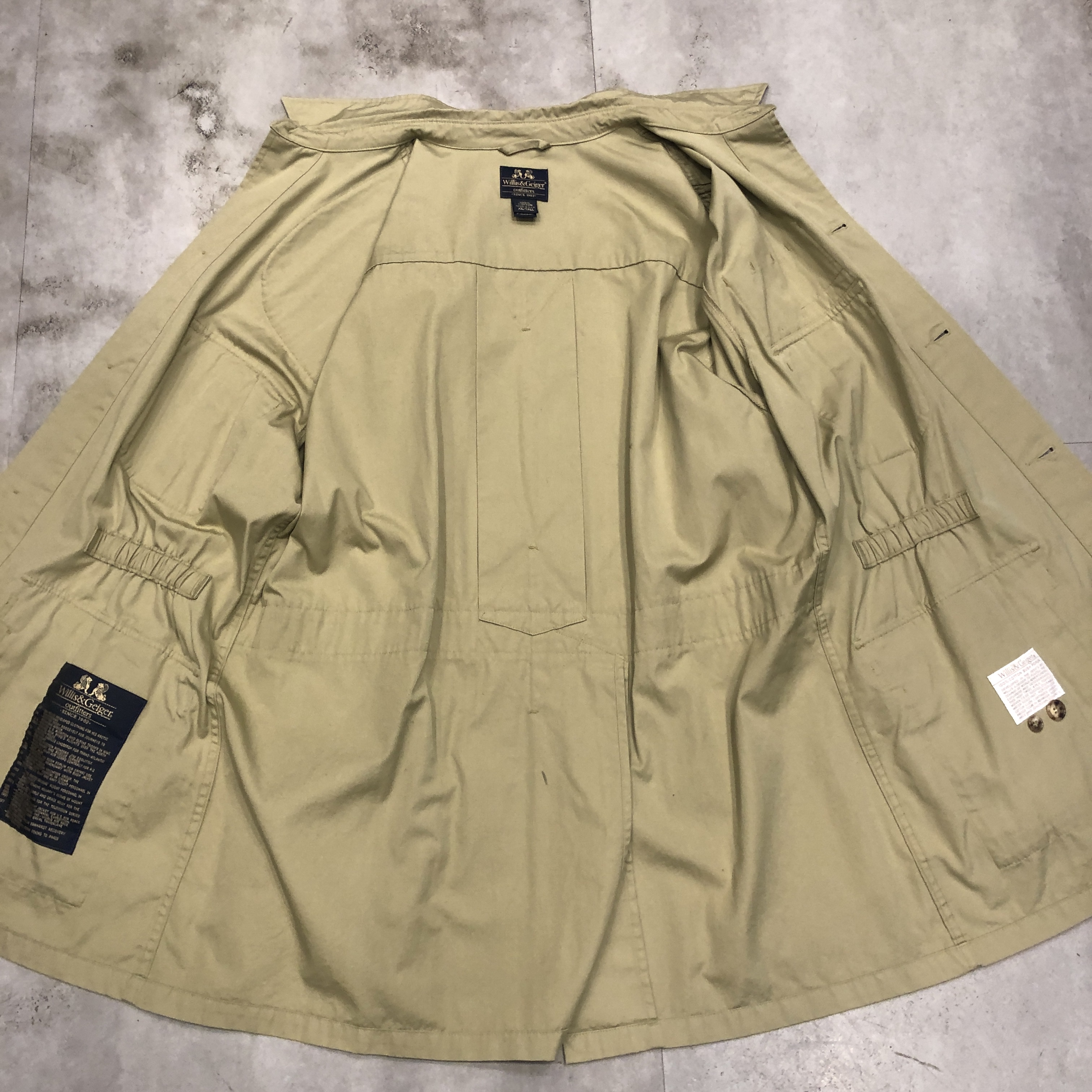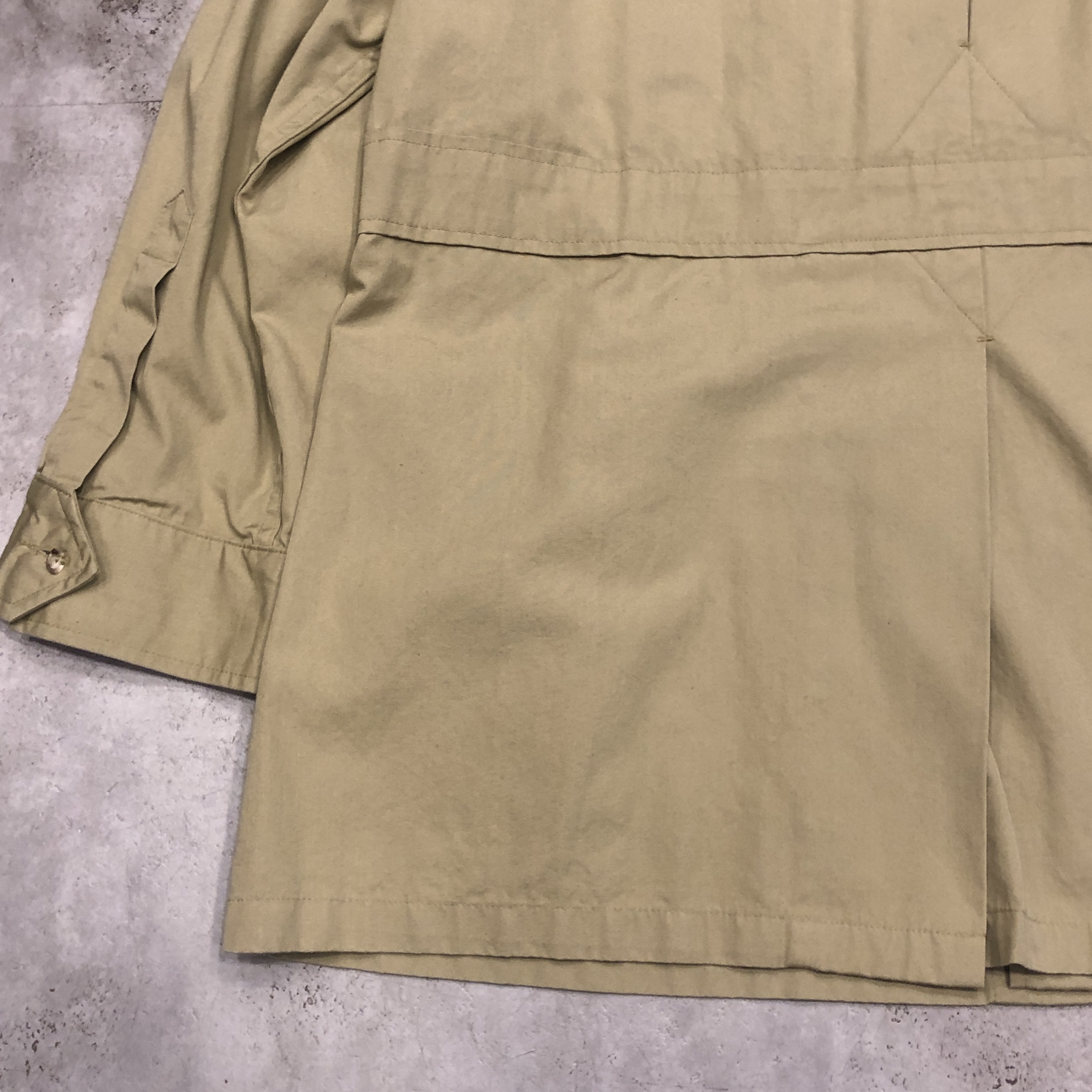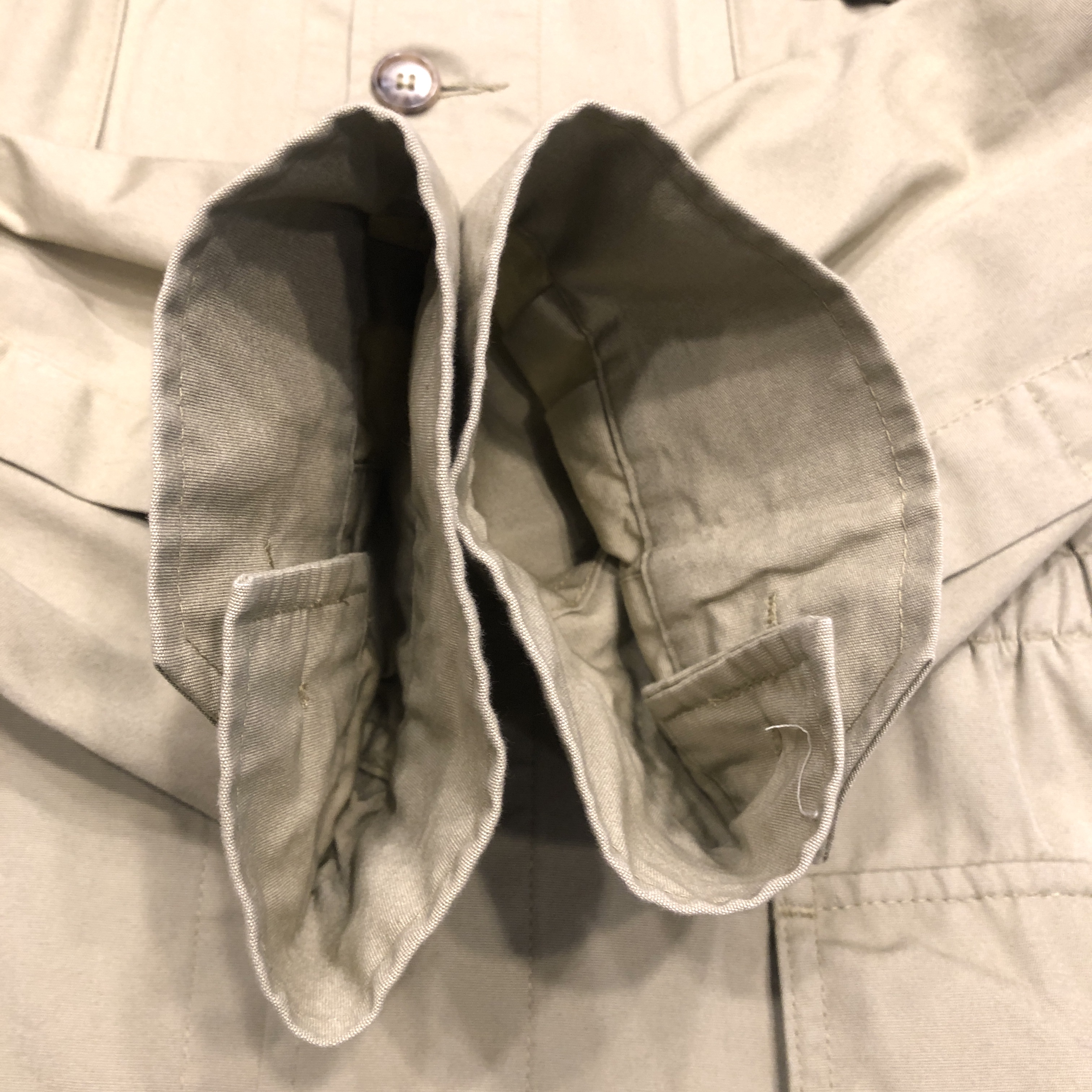 表地はウィリス&ガイガー伝統の“コットン・ブッシュポプリン”。7.5オンスという厚みを持ちながら、しなやかで水にも強く、経年で美しい表情を見せてくれます。4つの大型フラップポケット、肩のキルティング補強、絶妙なウエストギャザー、ミリタリージャケット譲りのショルダーループなど、随所に機能美が溢れるディテール。内タグには当時から変わらぬ開発コンセプトが誇らしげに記されています。