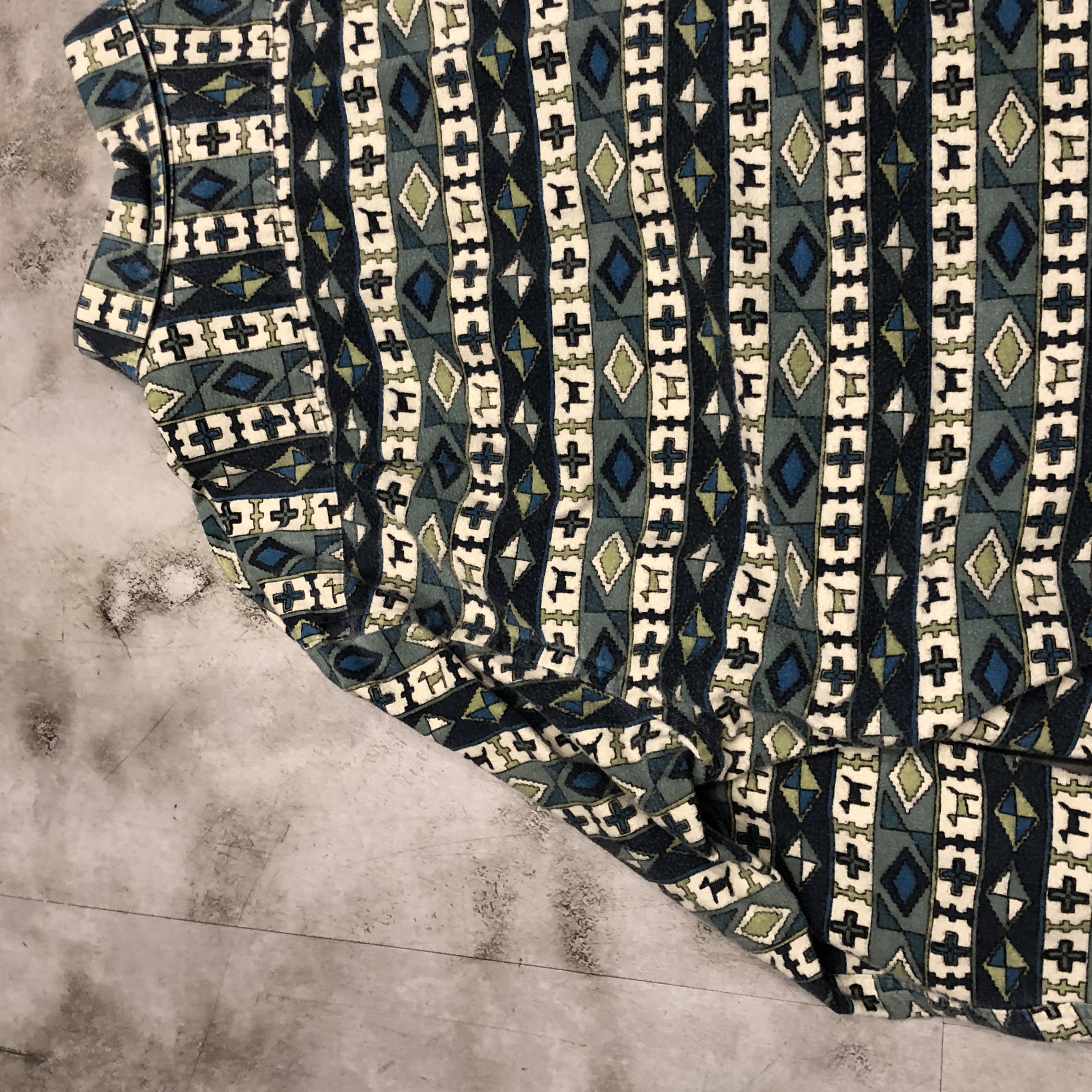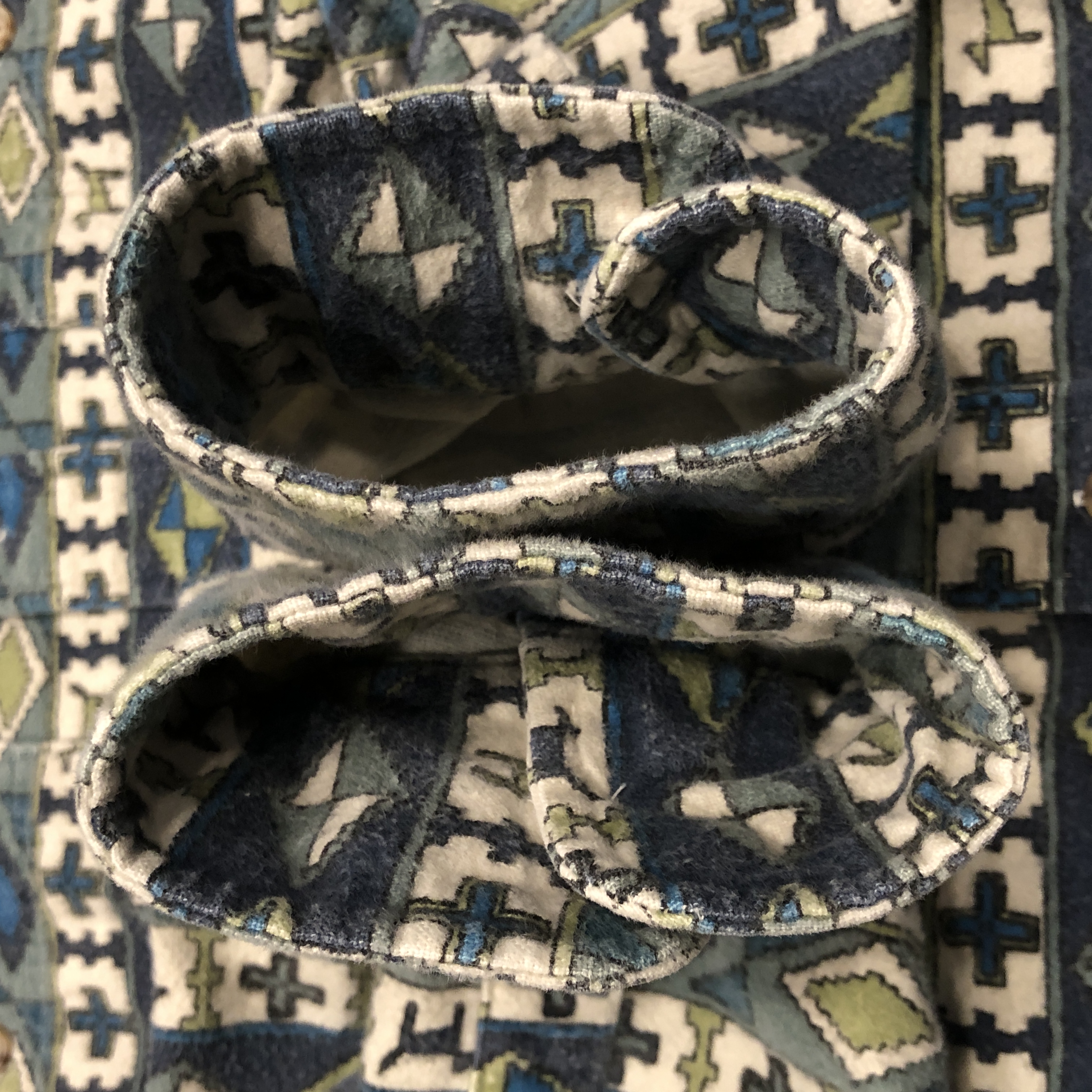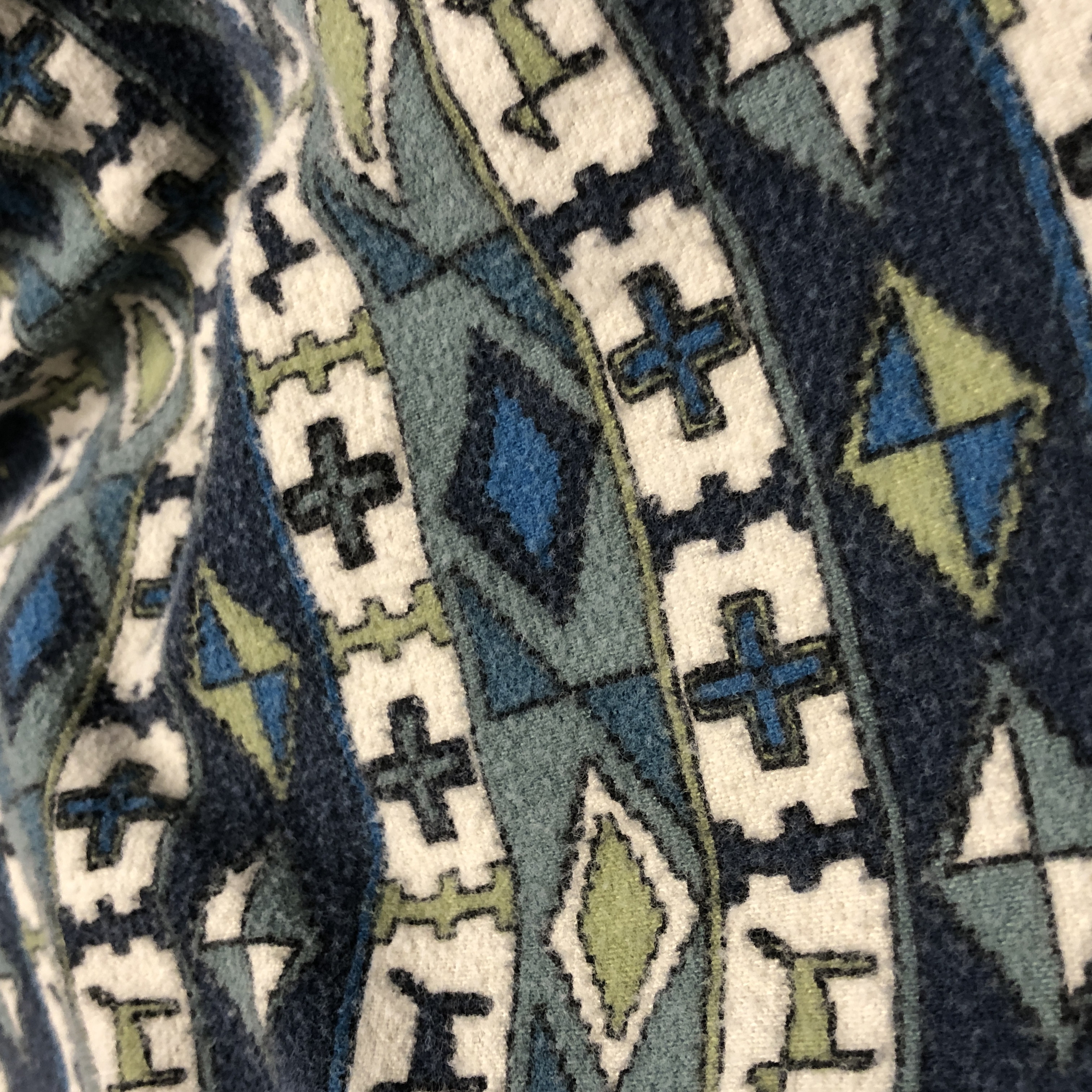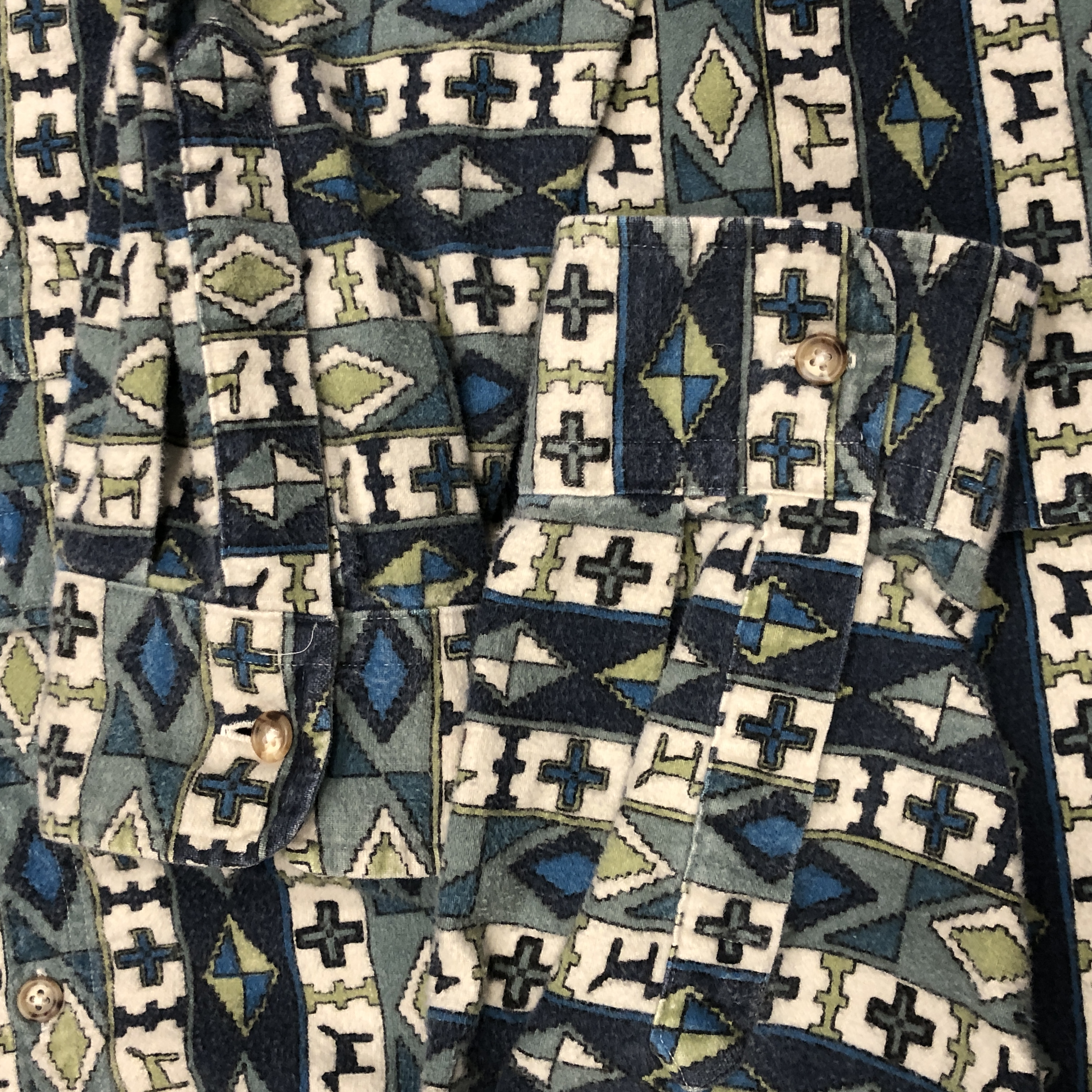 特徴的なのはこの柄。クロスモチーフやダイヤ柄、小さな動物のようなアイコンが規則的に並び、ネイティブ文様をベースにしながらも、どこか抽象的で洗練された印象。