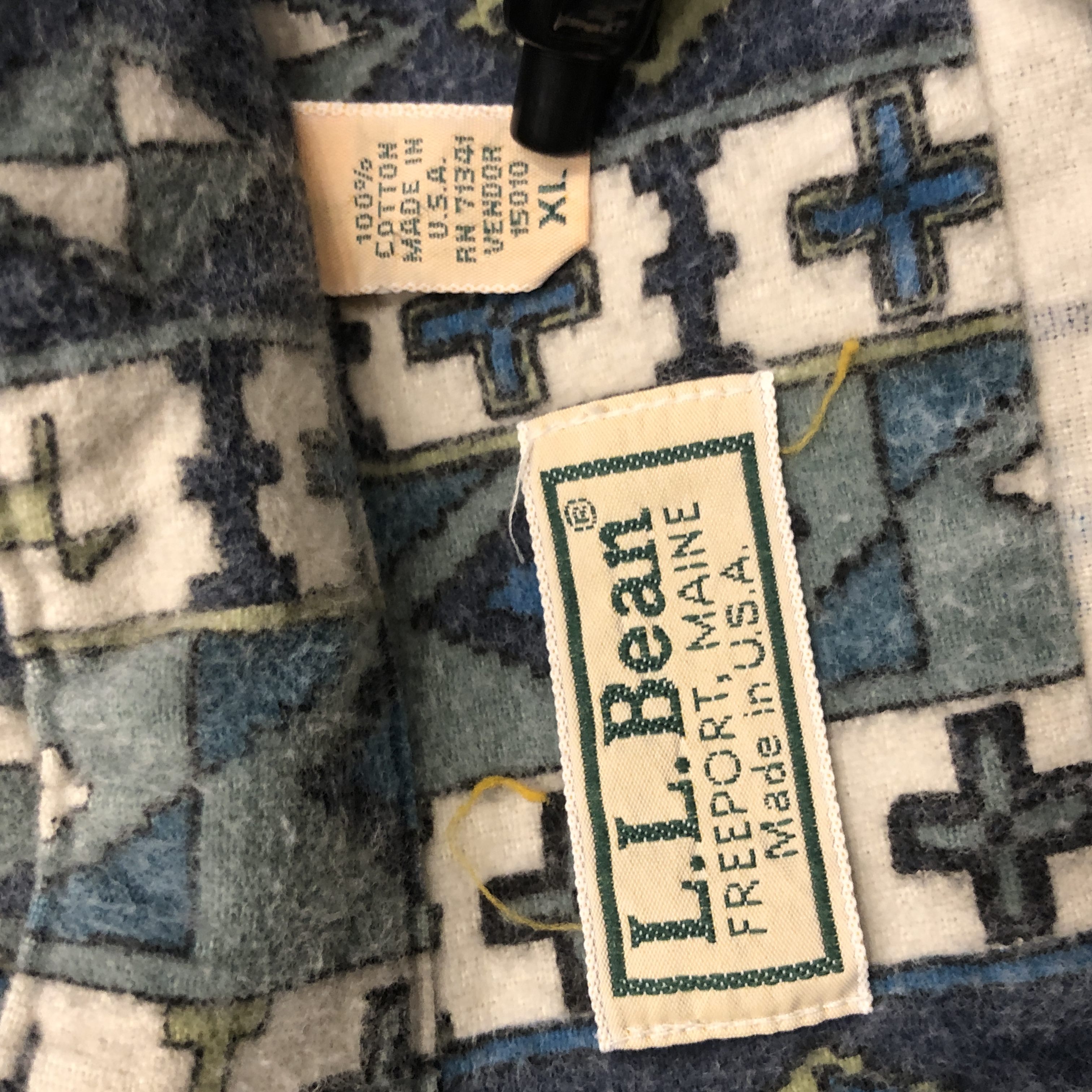 タグディテールから見ても1980年代後半〜90年代頃のUSA製。やはりこの時代のL.L.Beanは、こうした総柄でもどこか“日常に溶け込む”絶妙なバランス感を持っています。