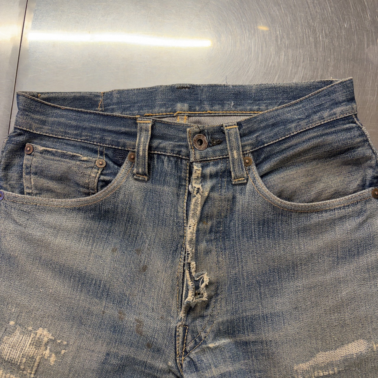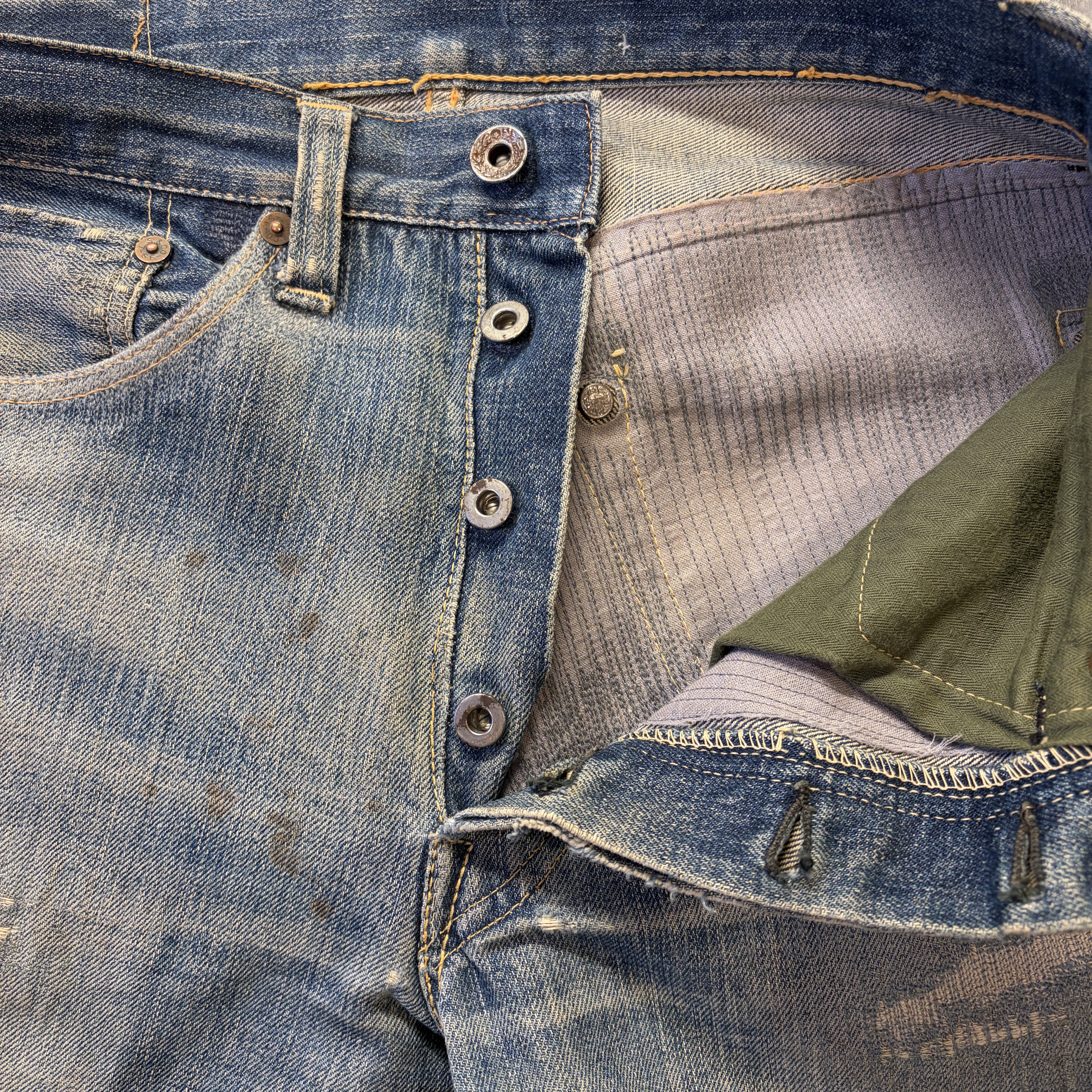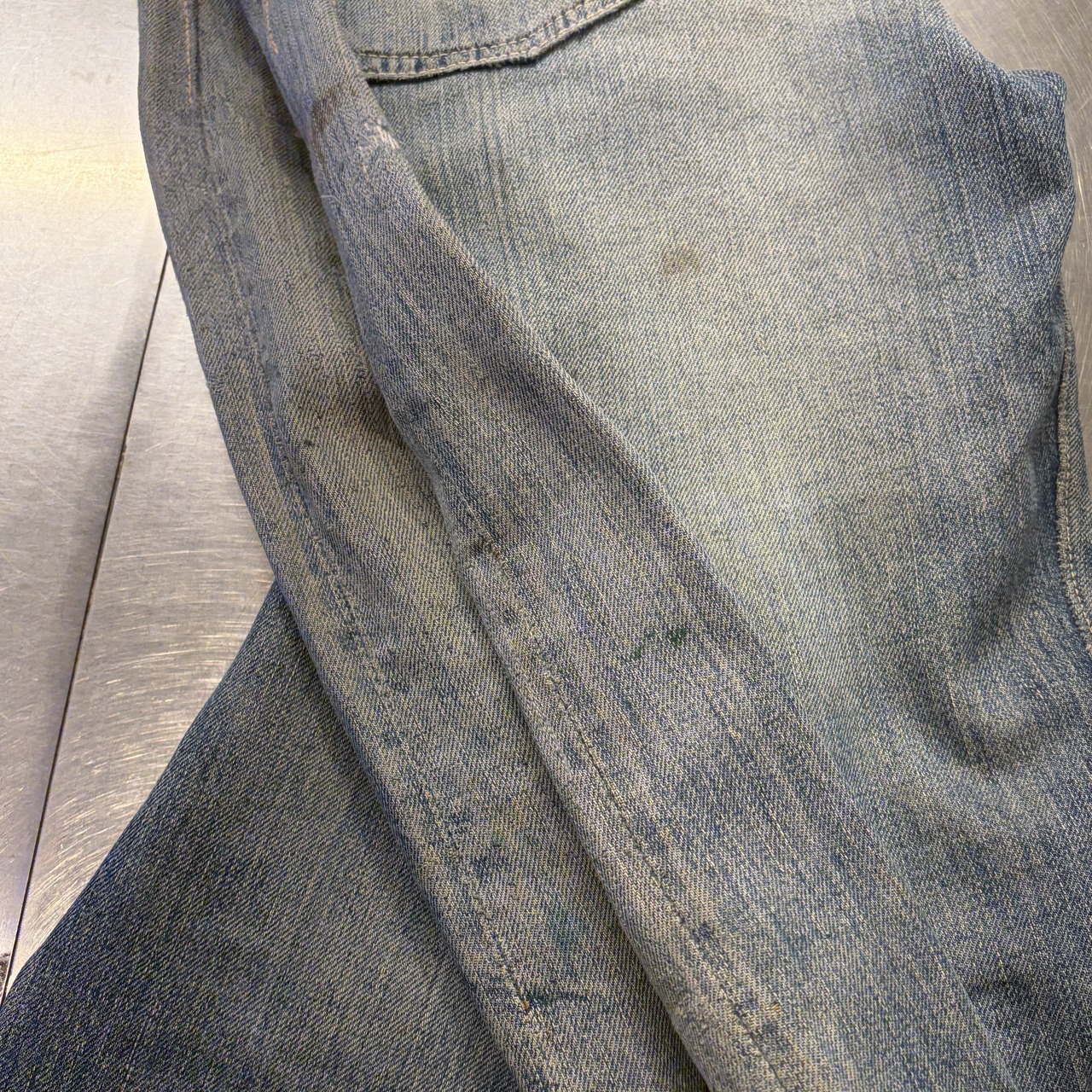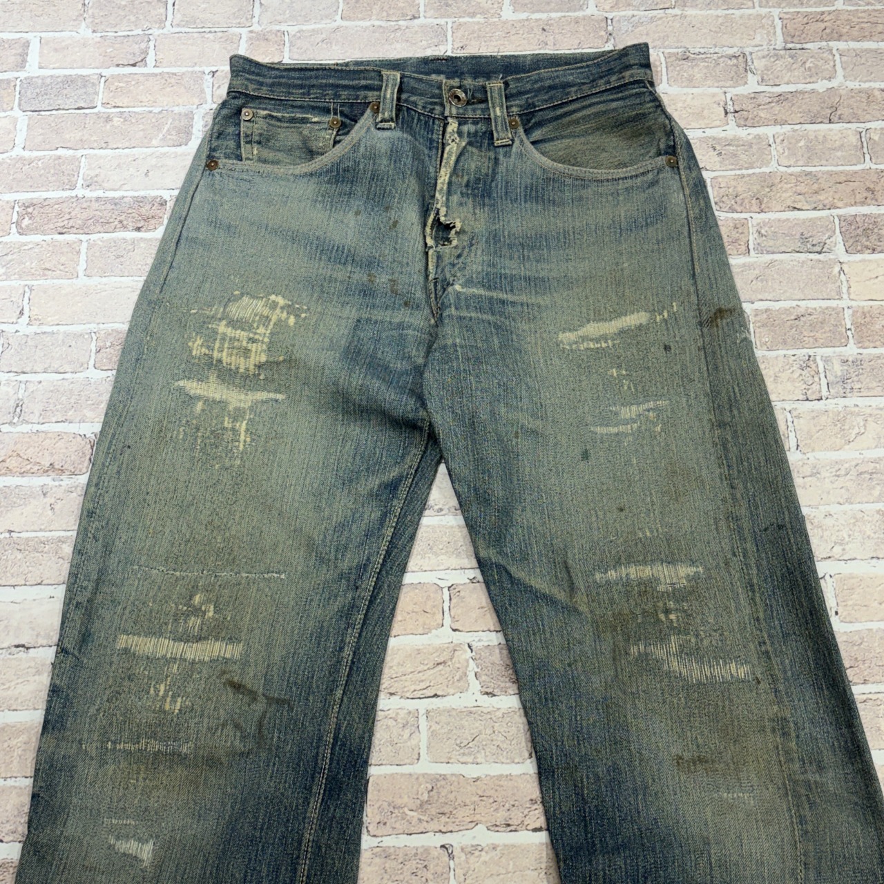 - 全体的にダメージや汚れがあり着用感ございます。リペア、リメイクも全体的にされており、ボタン等も付け替えられています。