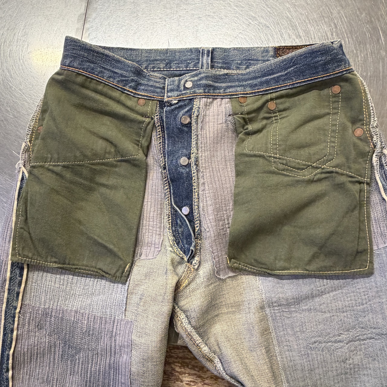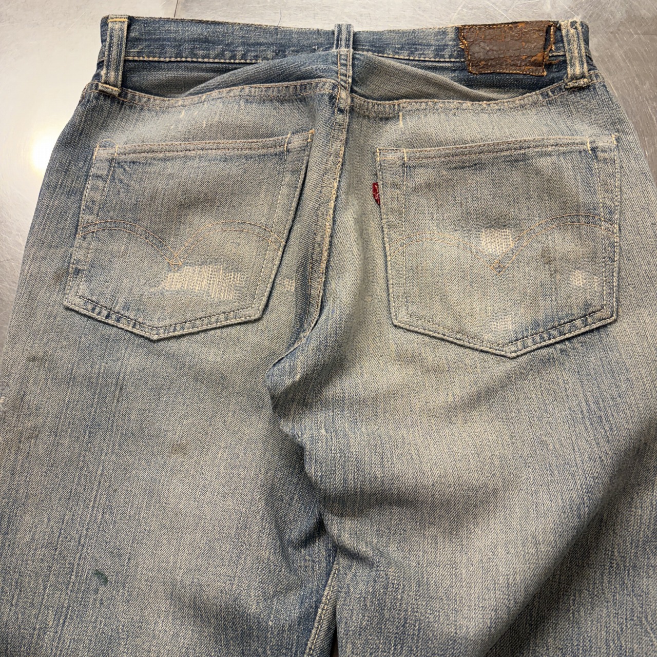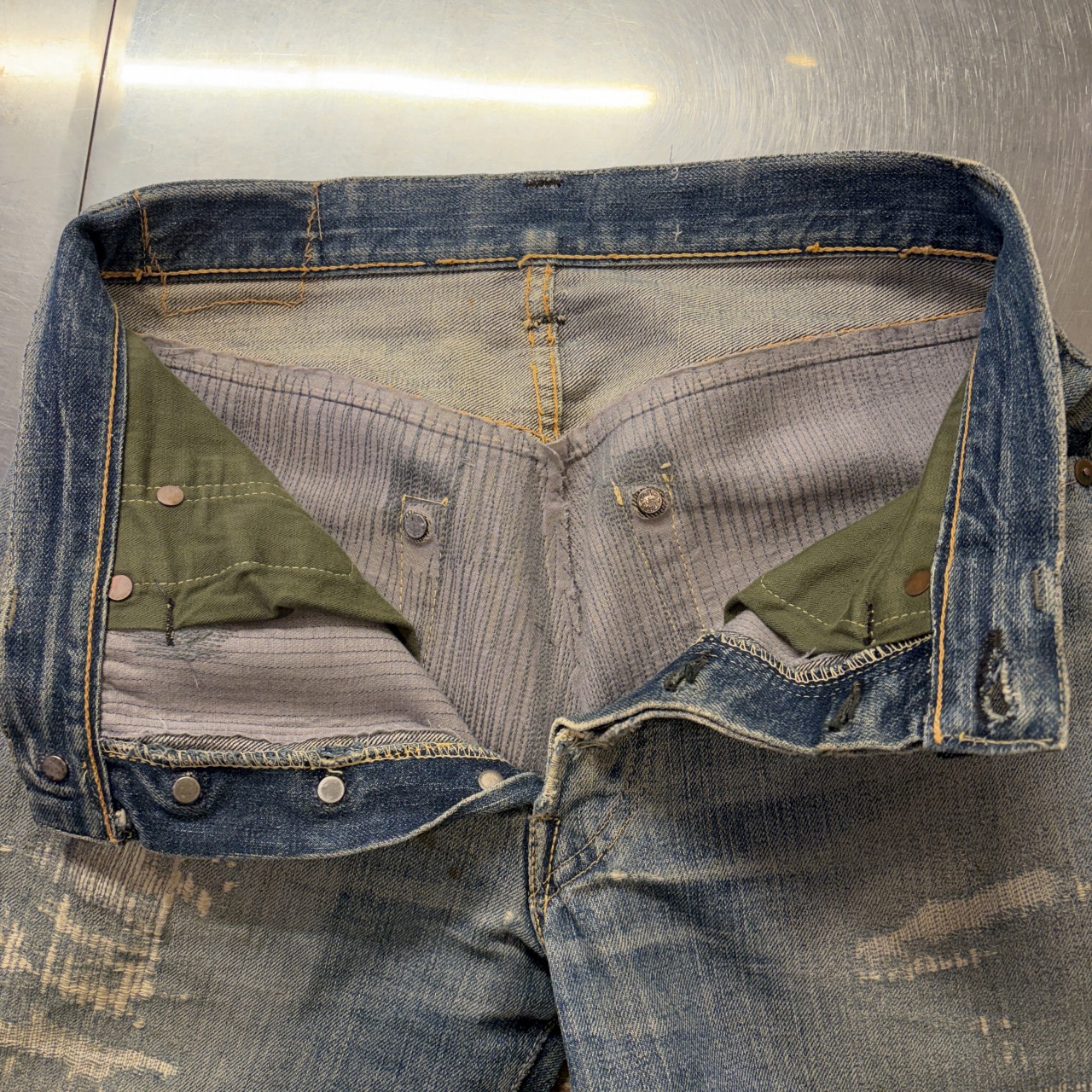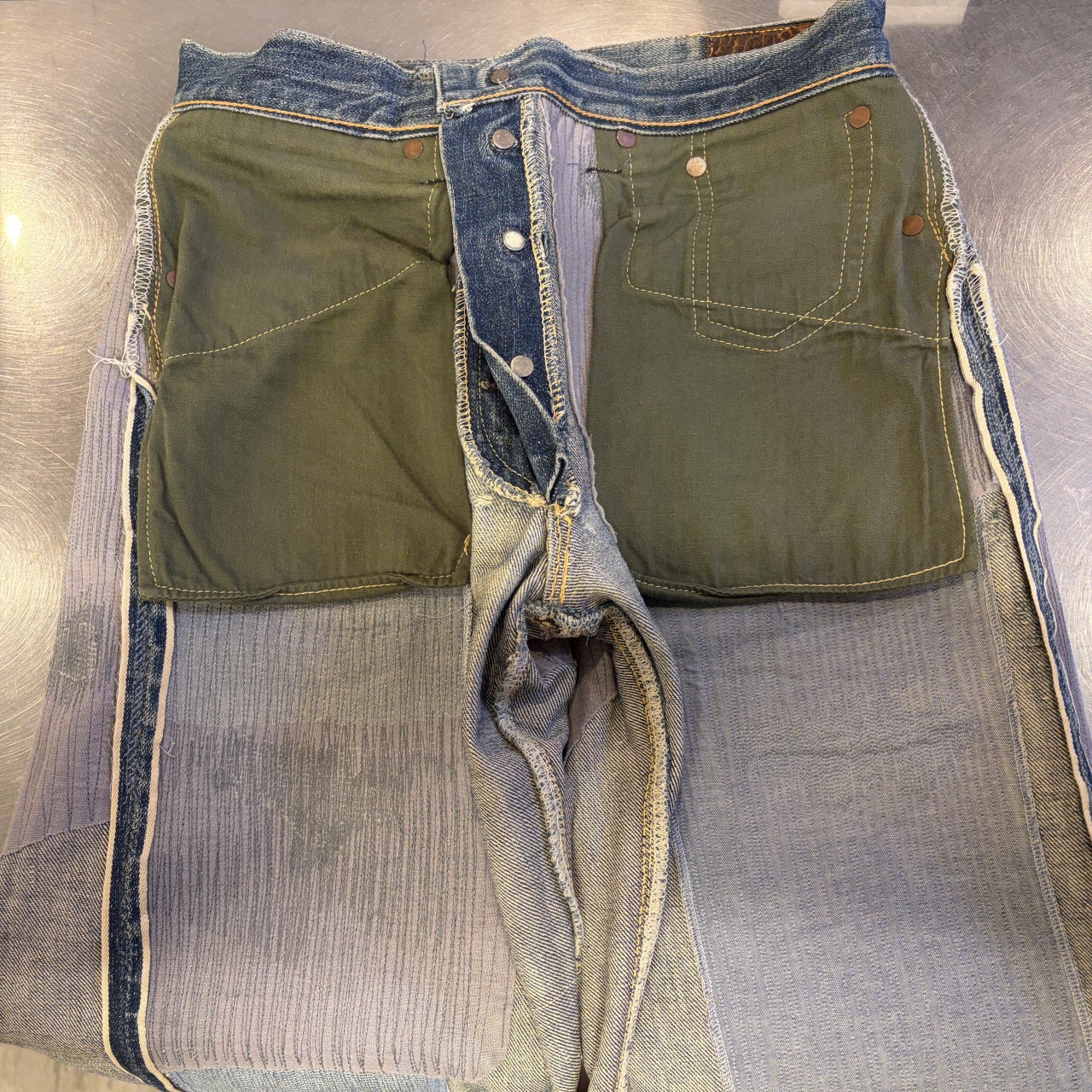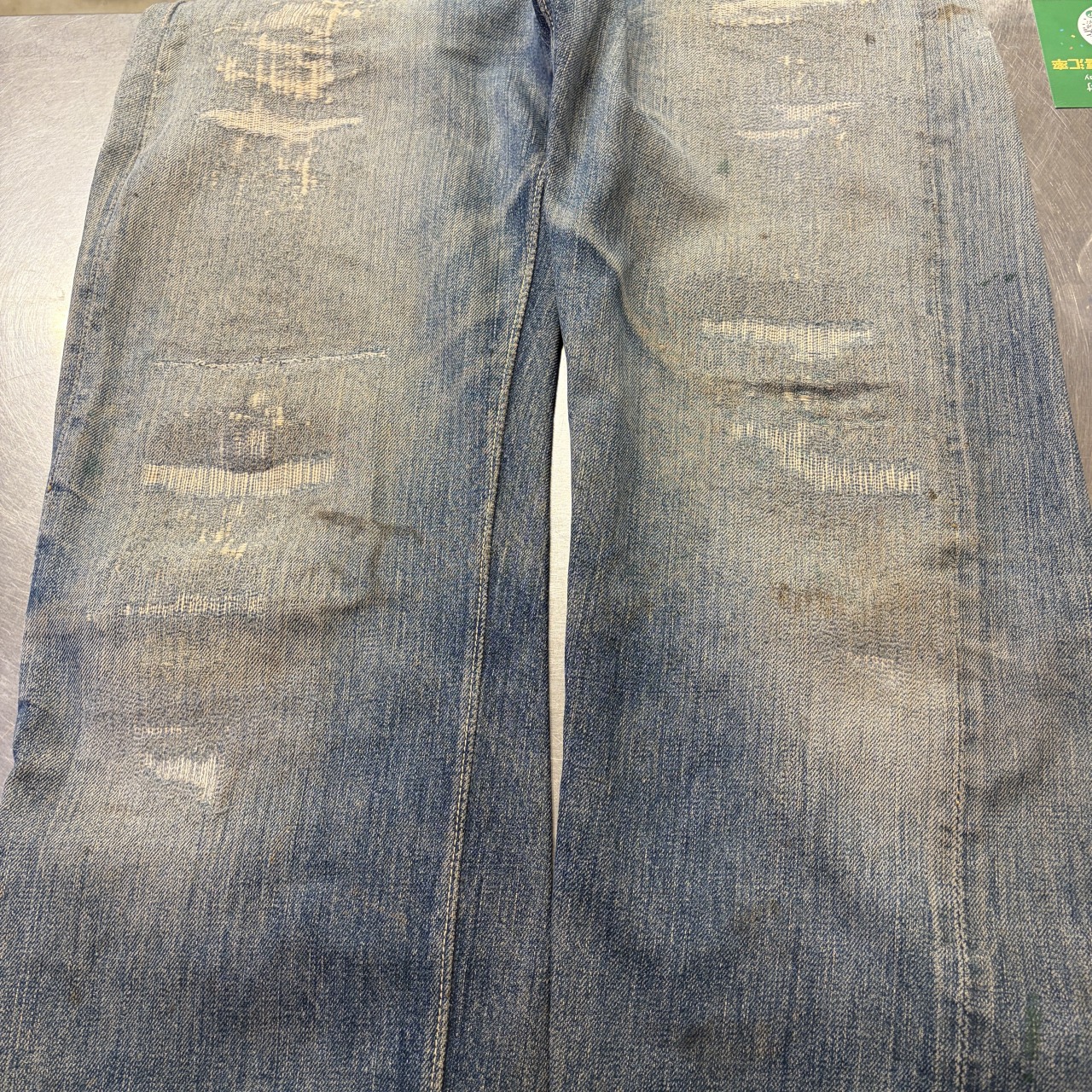 - 全体的にダメージや汚れがあり着用感ございます。リペア、リメイクも全体的にされており、ボタン等も付け替えられています。