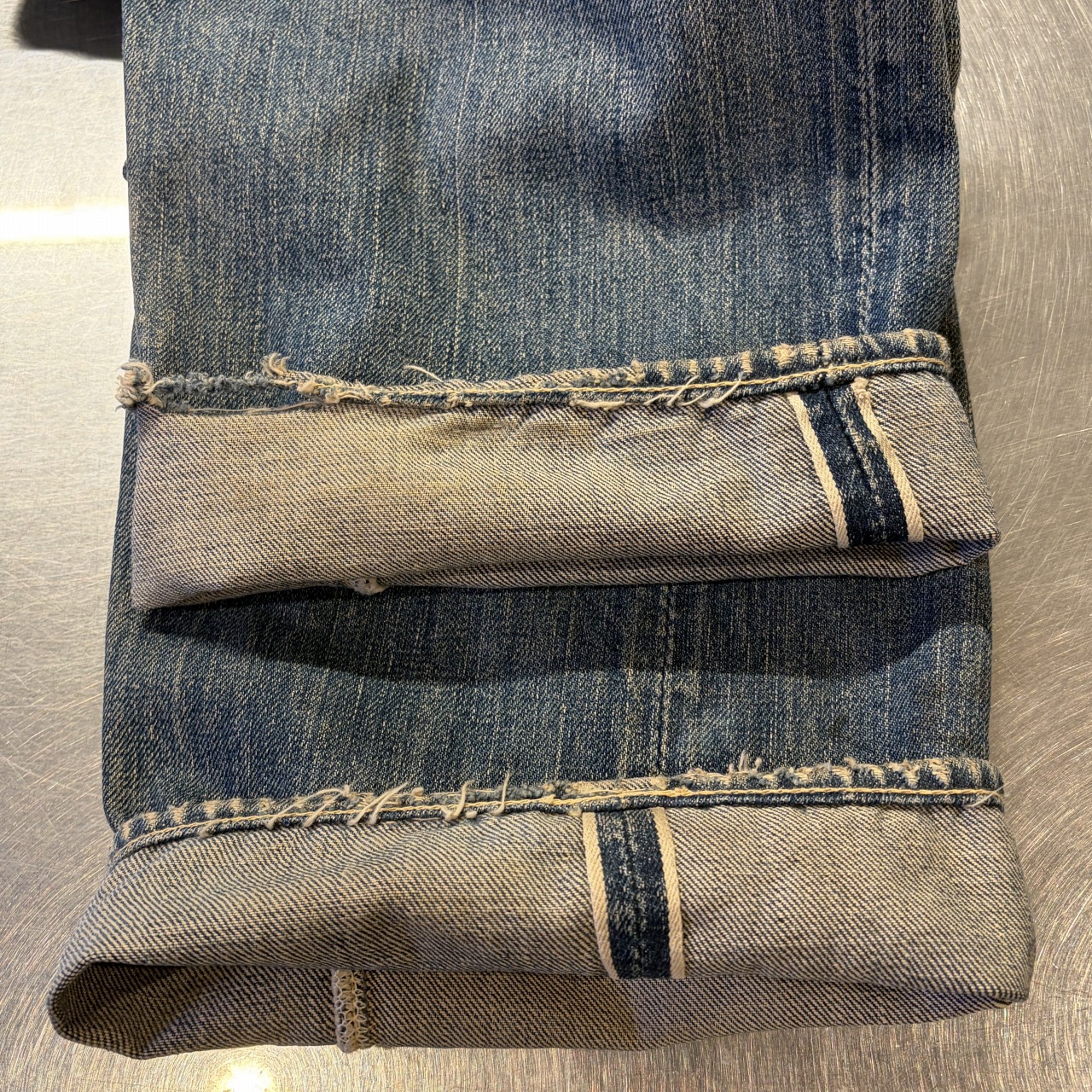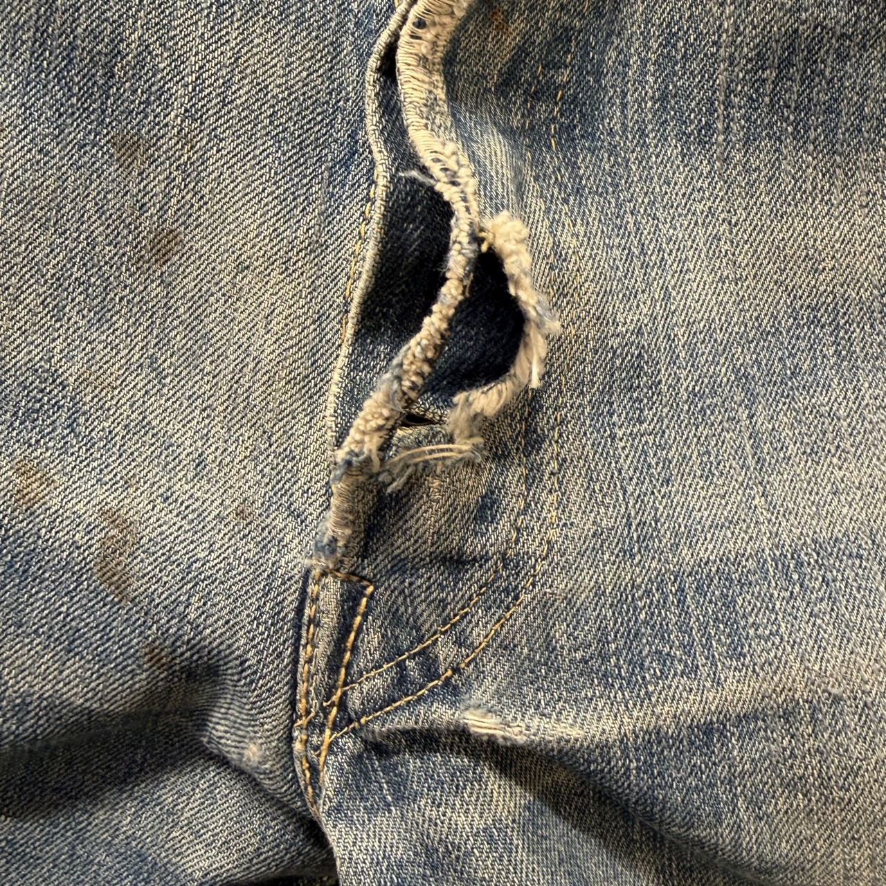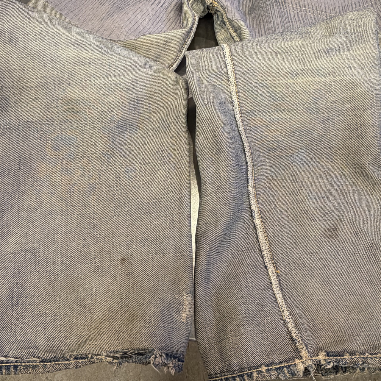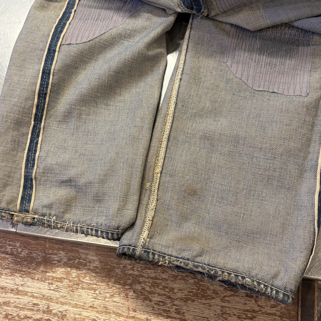 - 全体的にダメージや汚れがあり着用感ございます。リペア、リメイクも全体的にされており、ボタン等も付け替えられています。