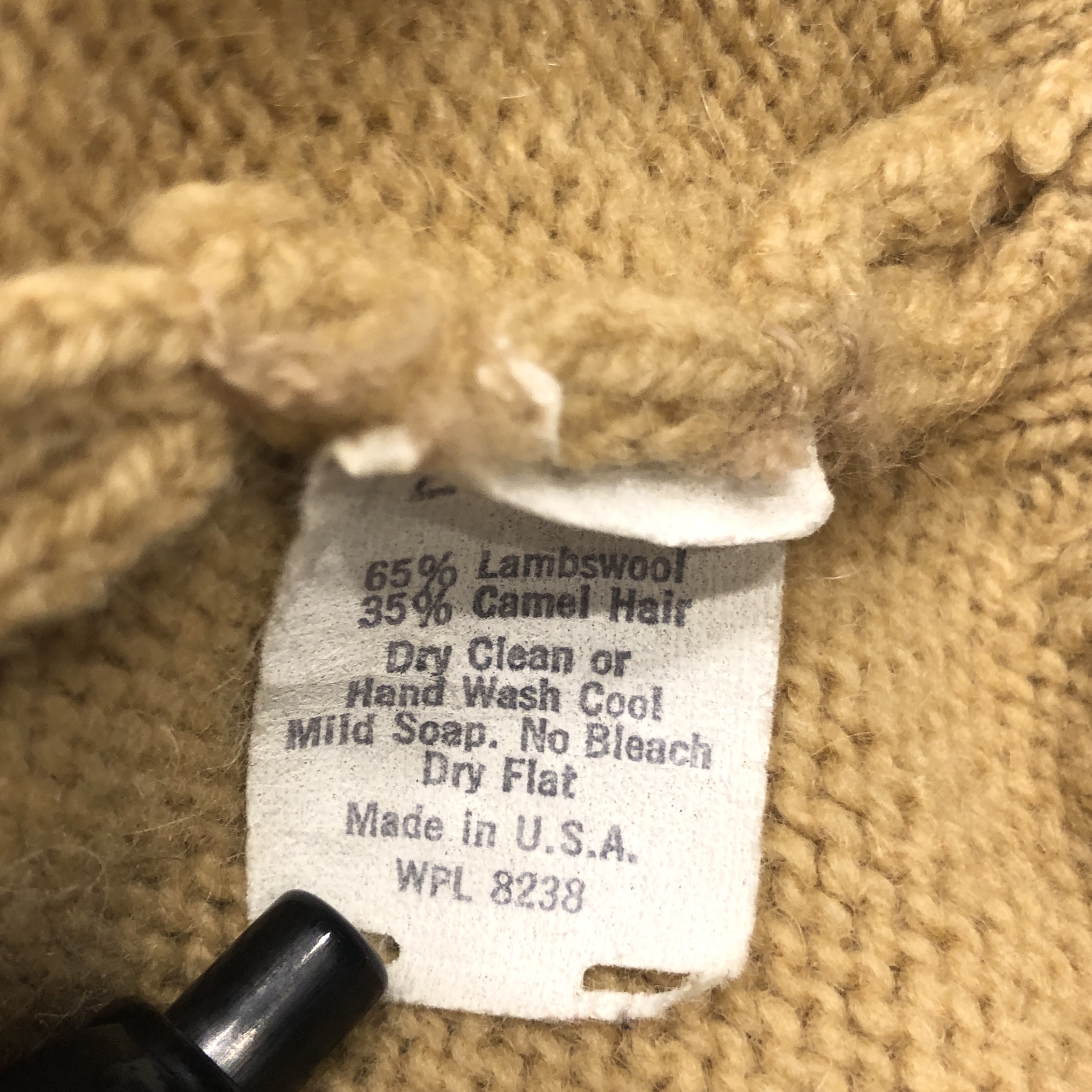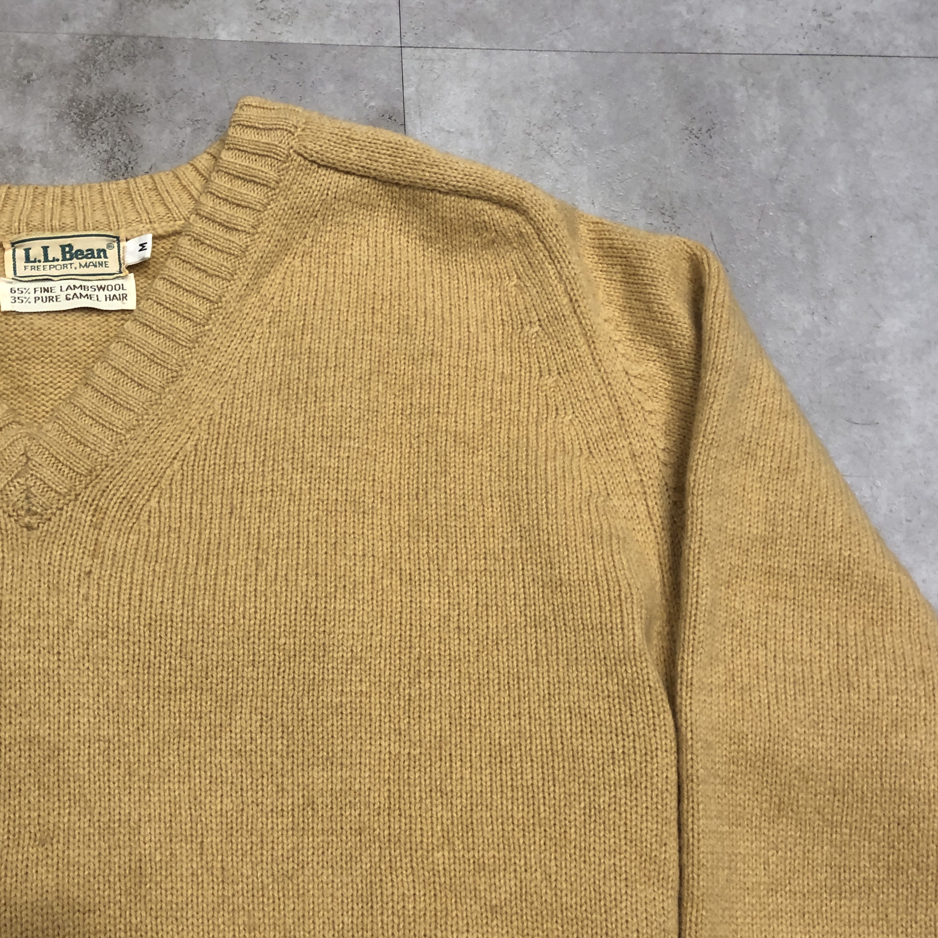 タグ表記からも確認できる通り、素材は65%ファインラムズウール × 35%ピュアキャメルヘア。この配合がとにかく秀逸で、単なるウールニットとは一線を画す質感を持っています。