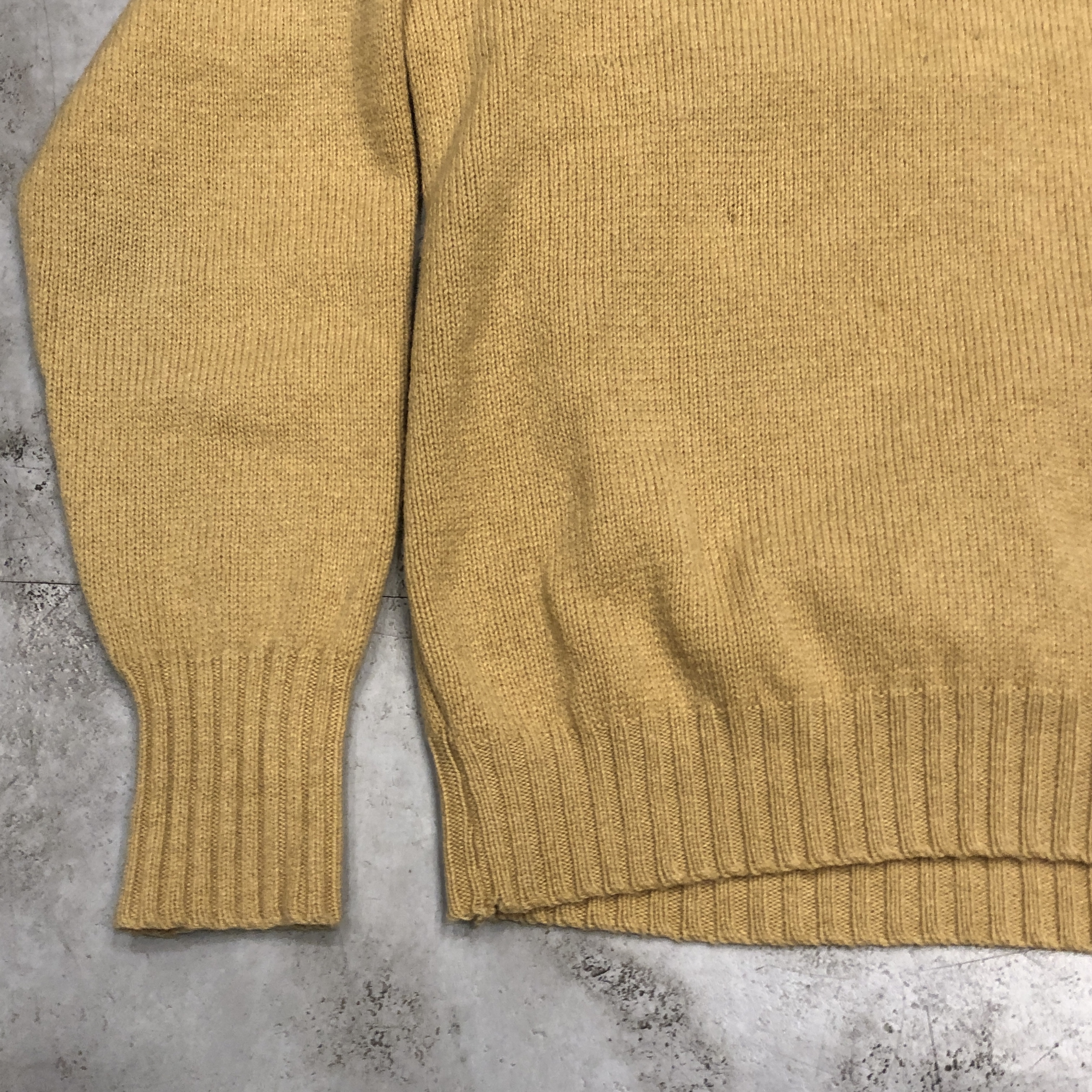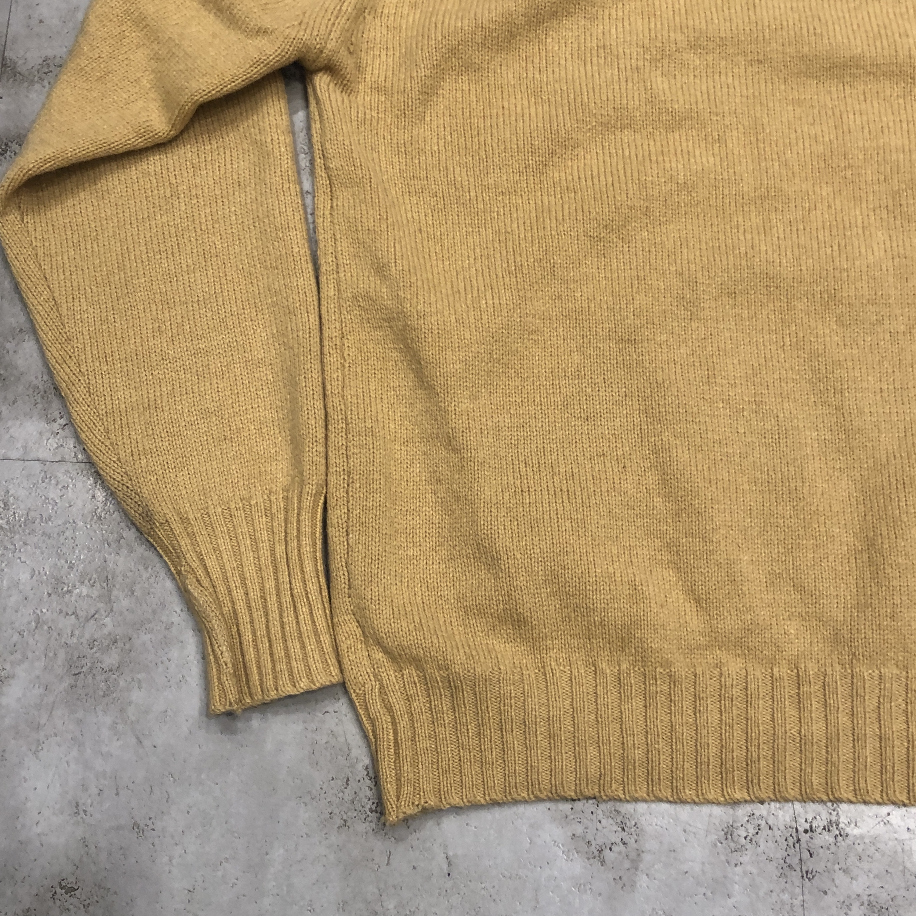 カラーは、いわゆるキャメルベージュですが、やや黄味を帯びたこのトーンは、どこかヴィンテージらしい深みを感じさせる色合い。シンプルなVネックだからこそ、この色と素材の良さがダイレクトに伝わってきます。
