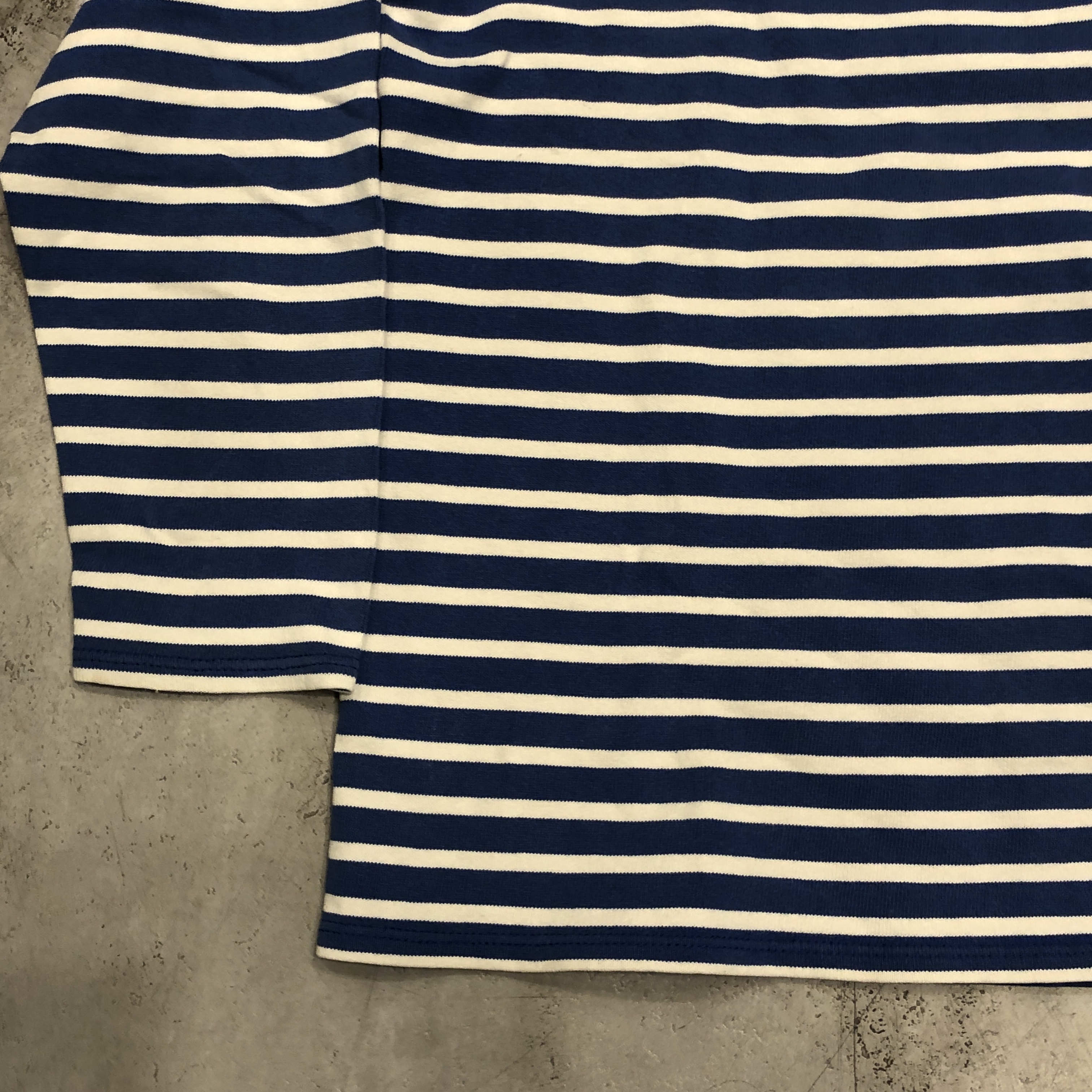 今回ご紹介するのは永遠の定番、ブルー/ ホワイトのボーダーカラー。ミリタリーやワークスタイルにも馴染み、カジュアルからシックまで幅広く対応します。素材は100%コットンの目の詰まった天竺生地。着始めはしっかりとした張り感があり、洗い込むことで徐々に柔らかく、肌馴染みの良い風合いへと育っていきます。
