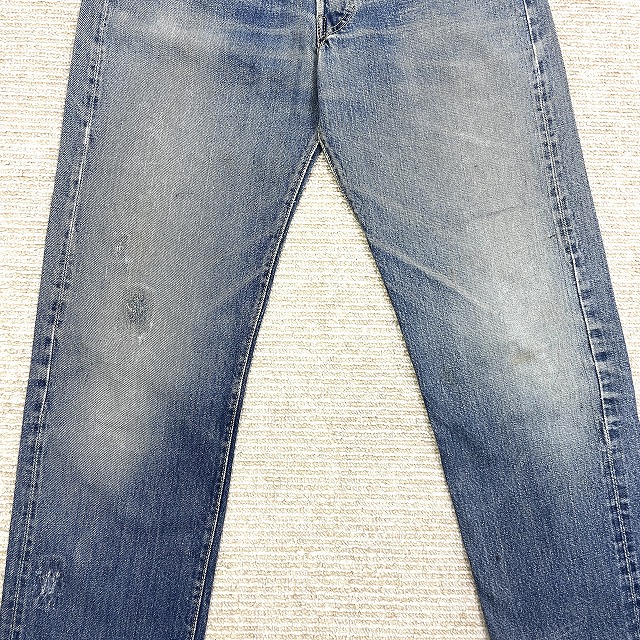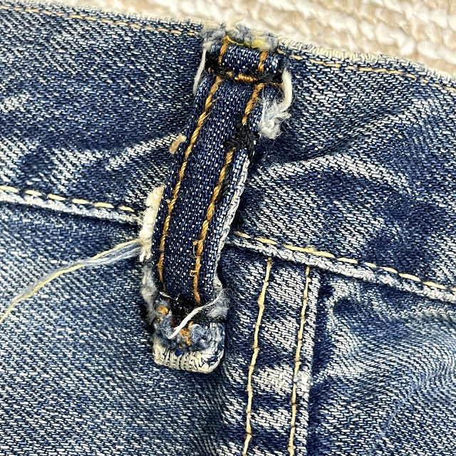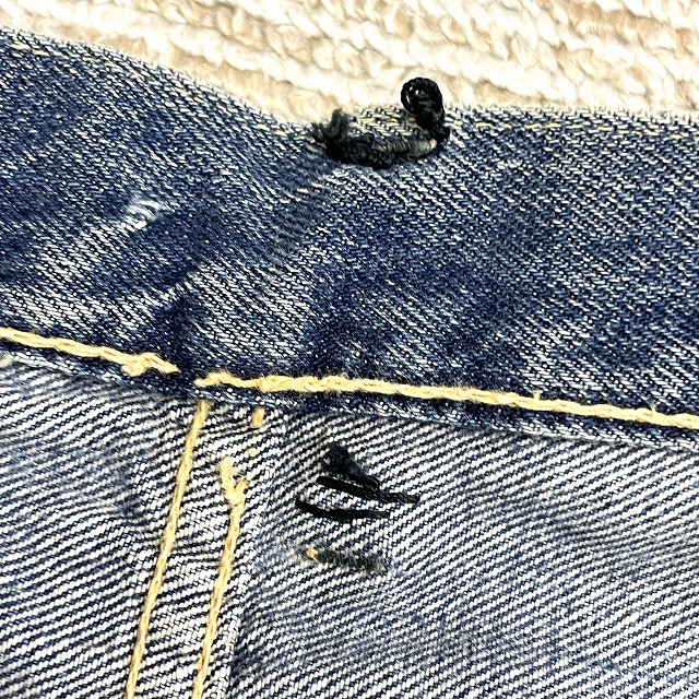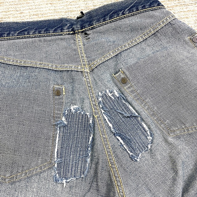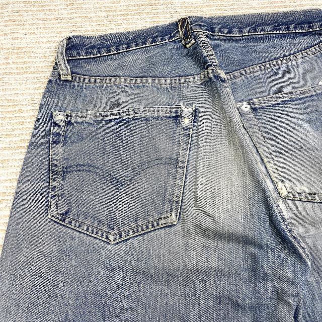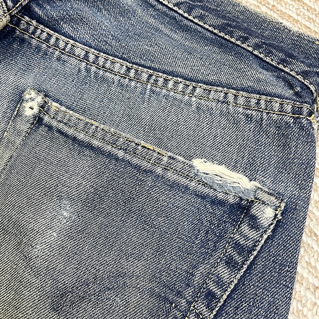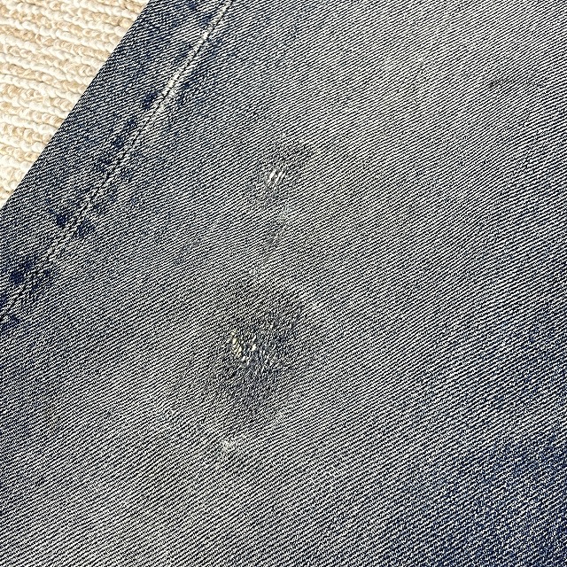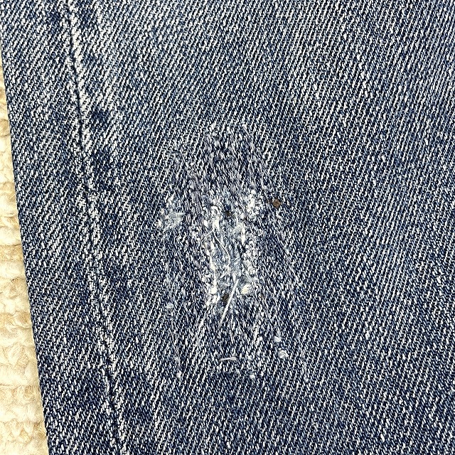 前右腿付近と右裾上、ヒップにリペアがあり、後中央のベルトループが交換されており手縫いで簡易的に縫われております。