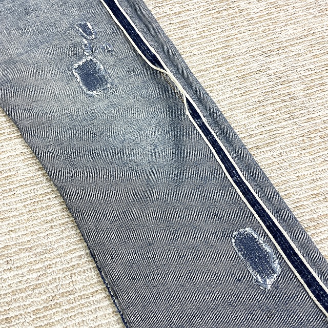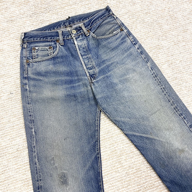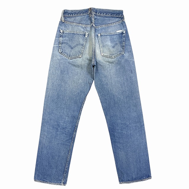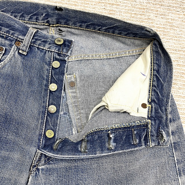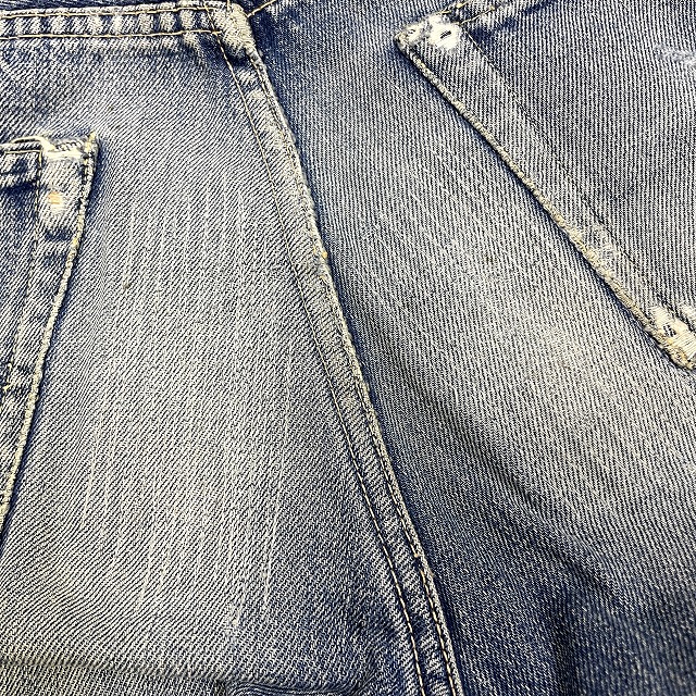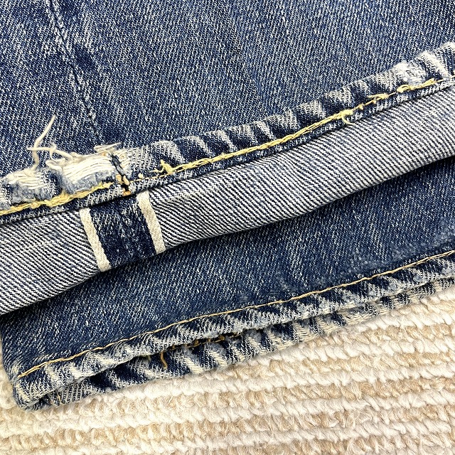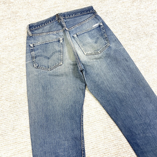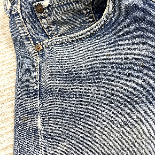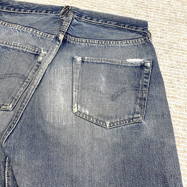 前右腿付近と右裾上、ヒップにリペアがあり、後中央のベルトループが交換されており手縫いで簡易的に縫われております。