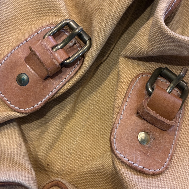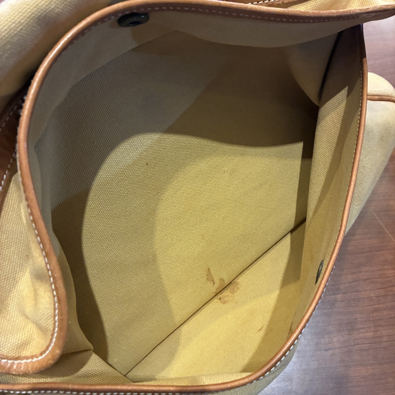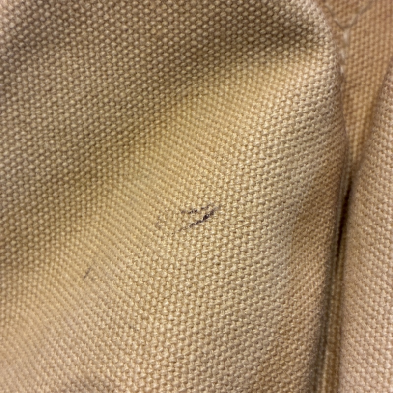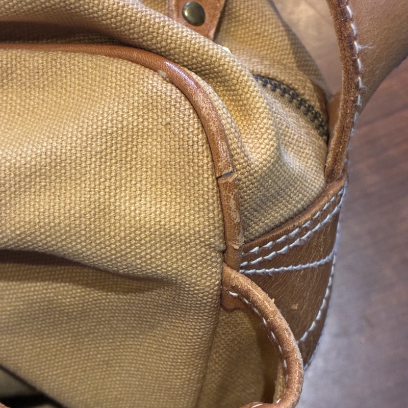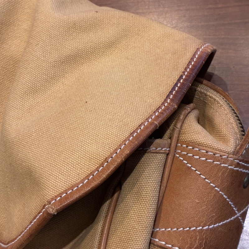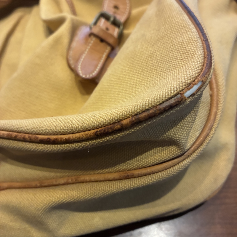 - 画像の様にレザー部分に劣化や割れとキャンバス部分に細かな汚れ、ストラップ部分のパーツが一部交換されております。(画像15枚目)