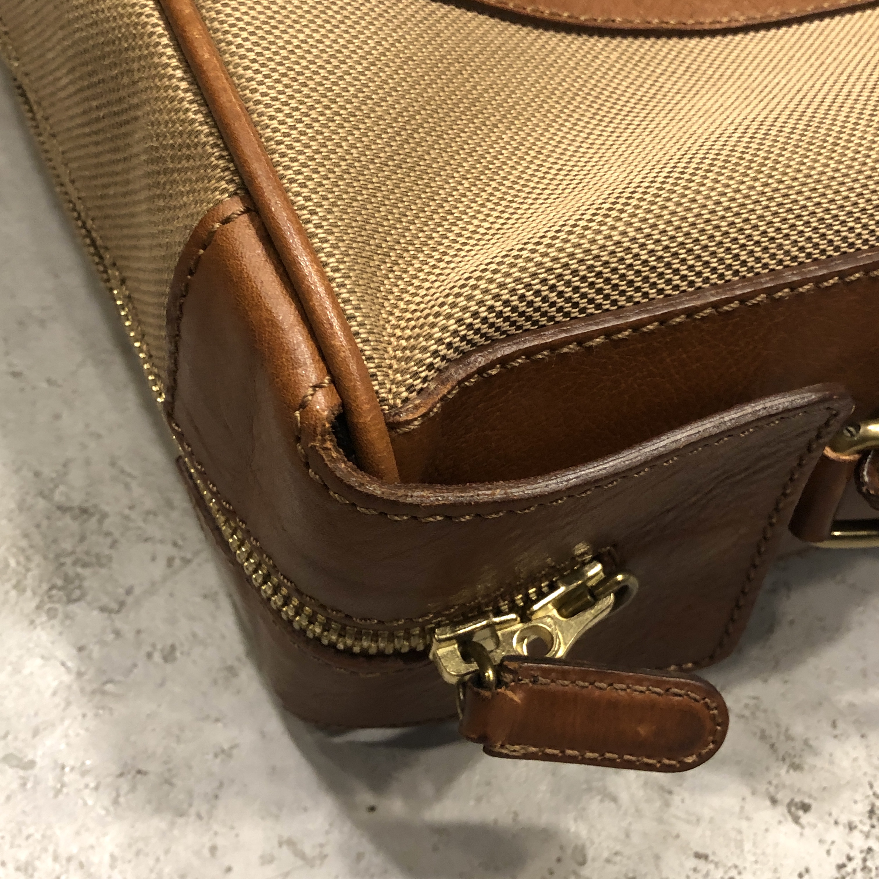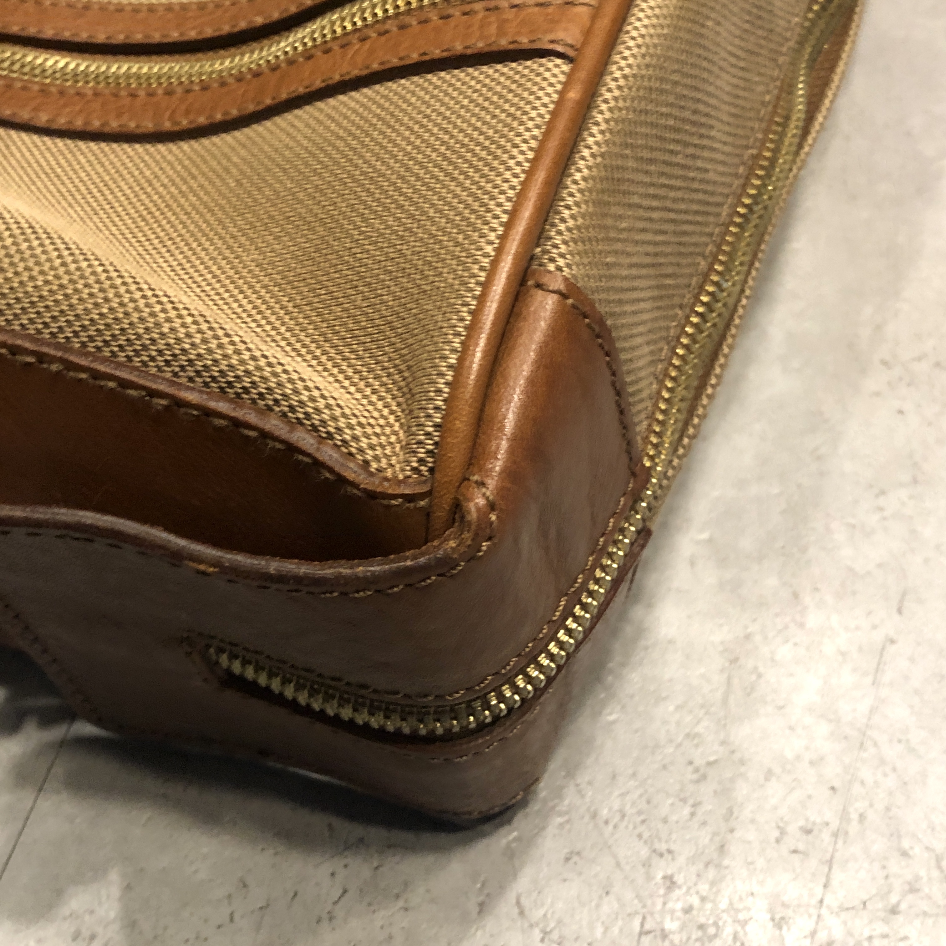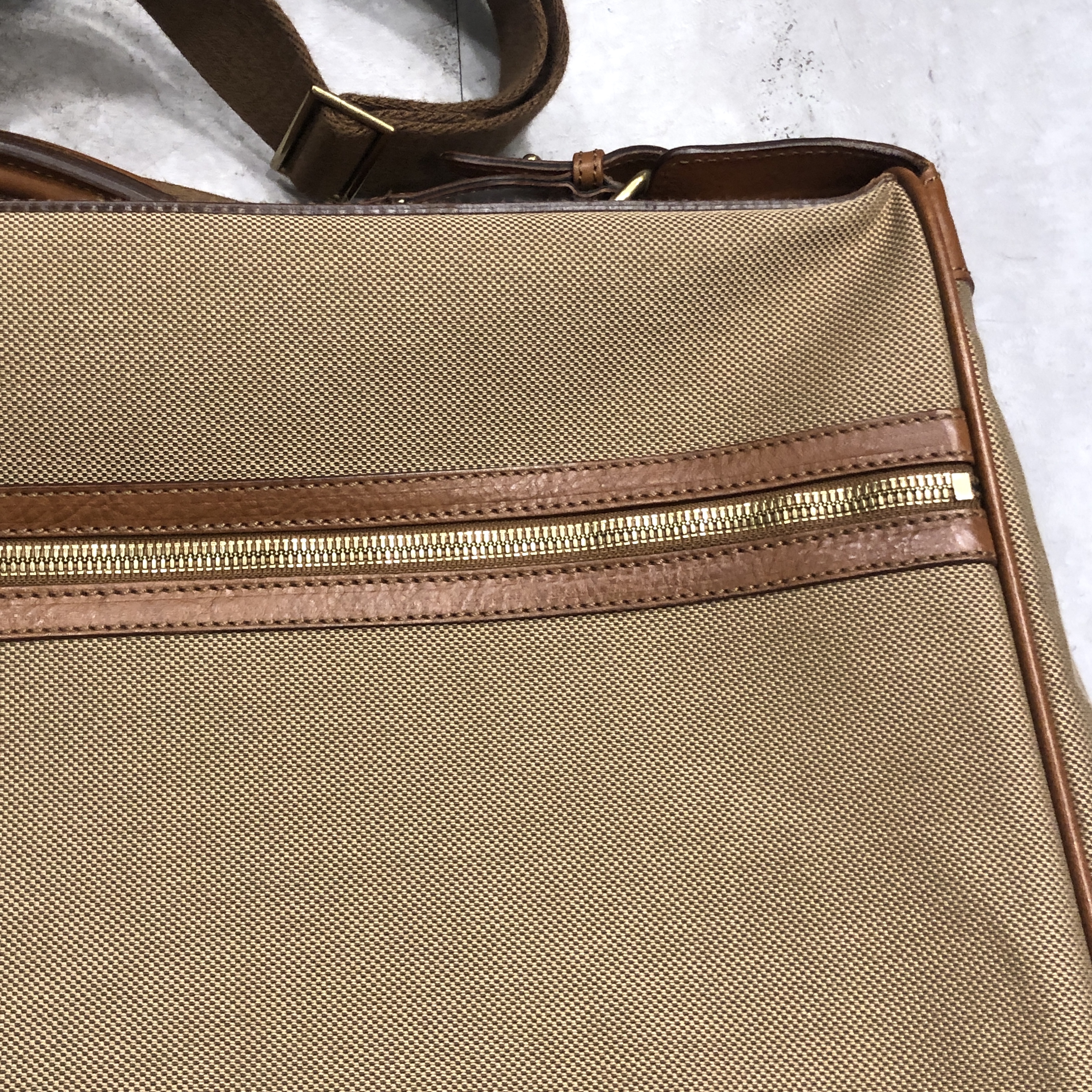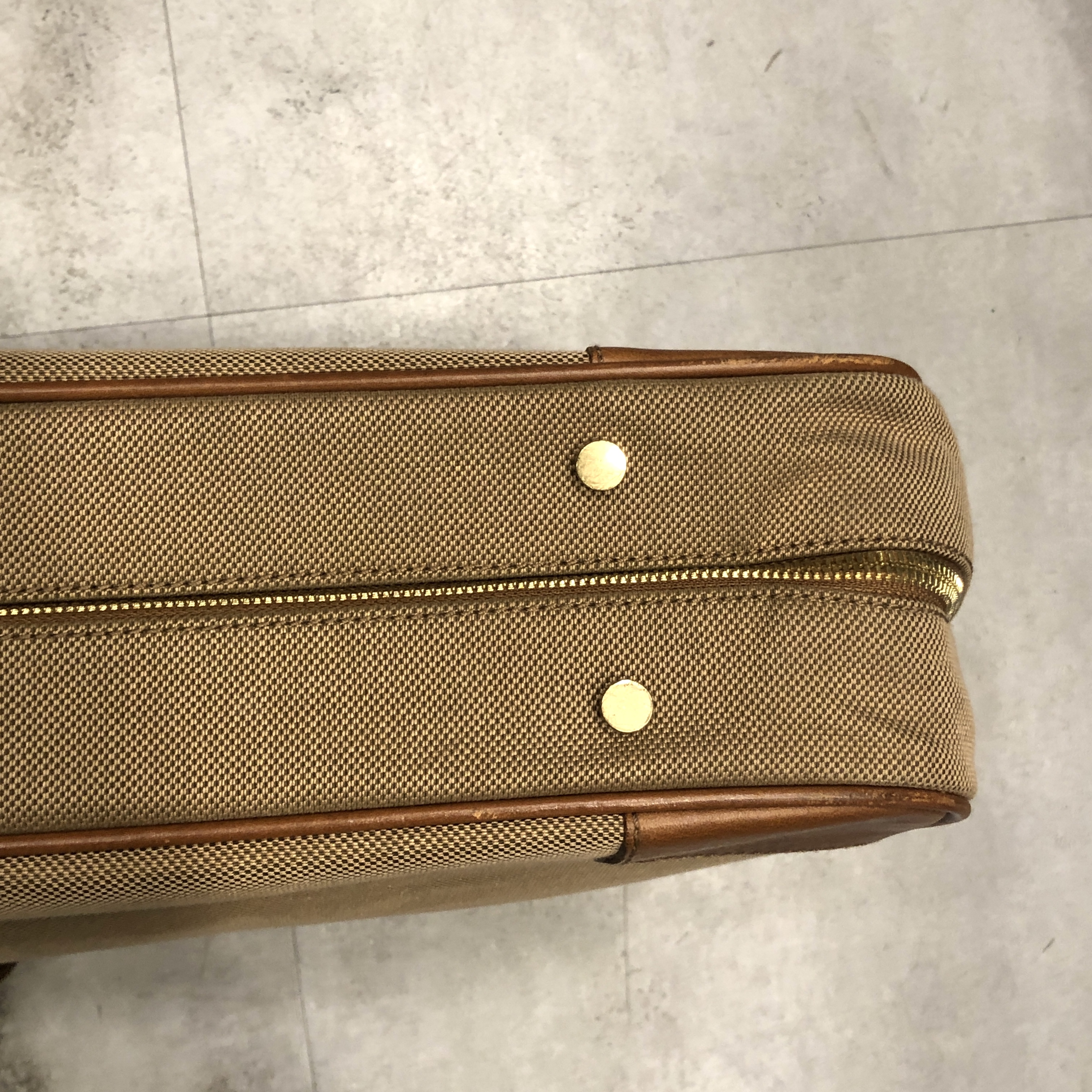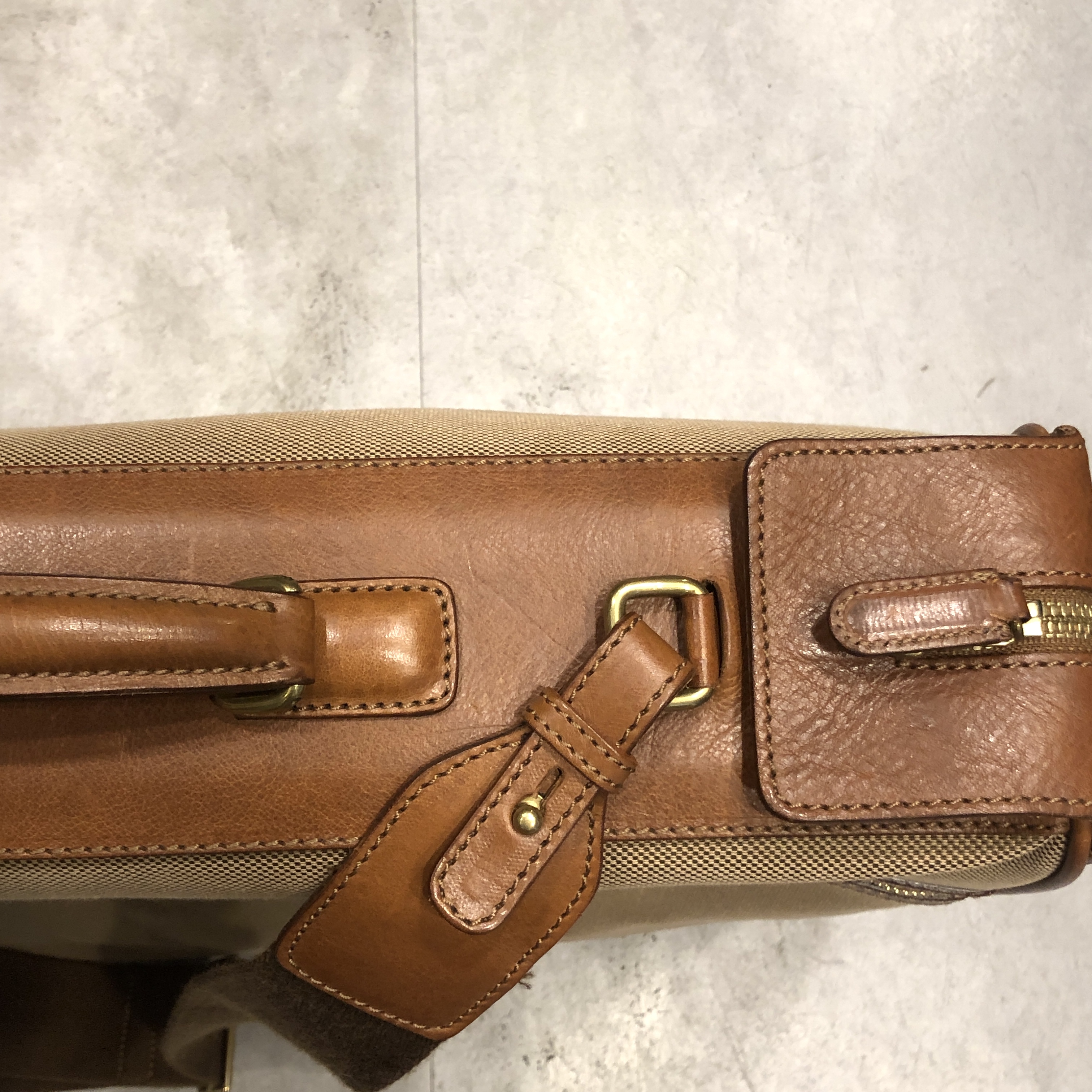 ベージュベースのボディに、ブラウンレザーのトリミング。