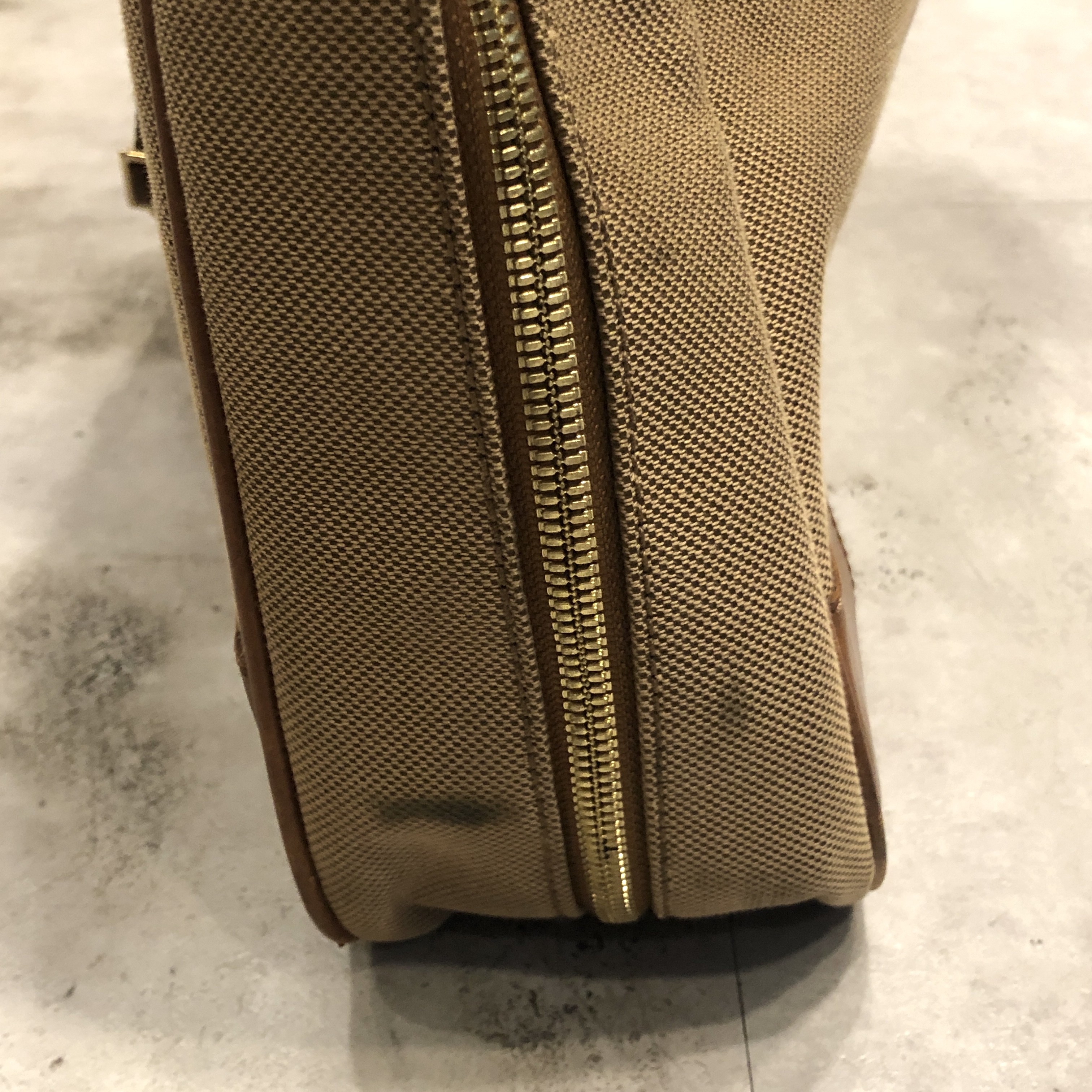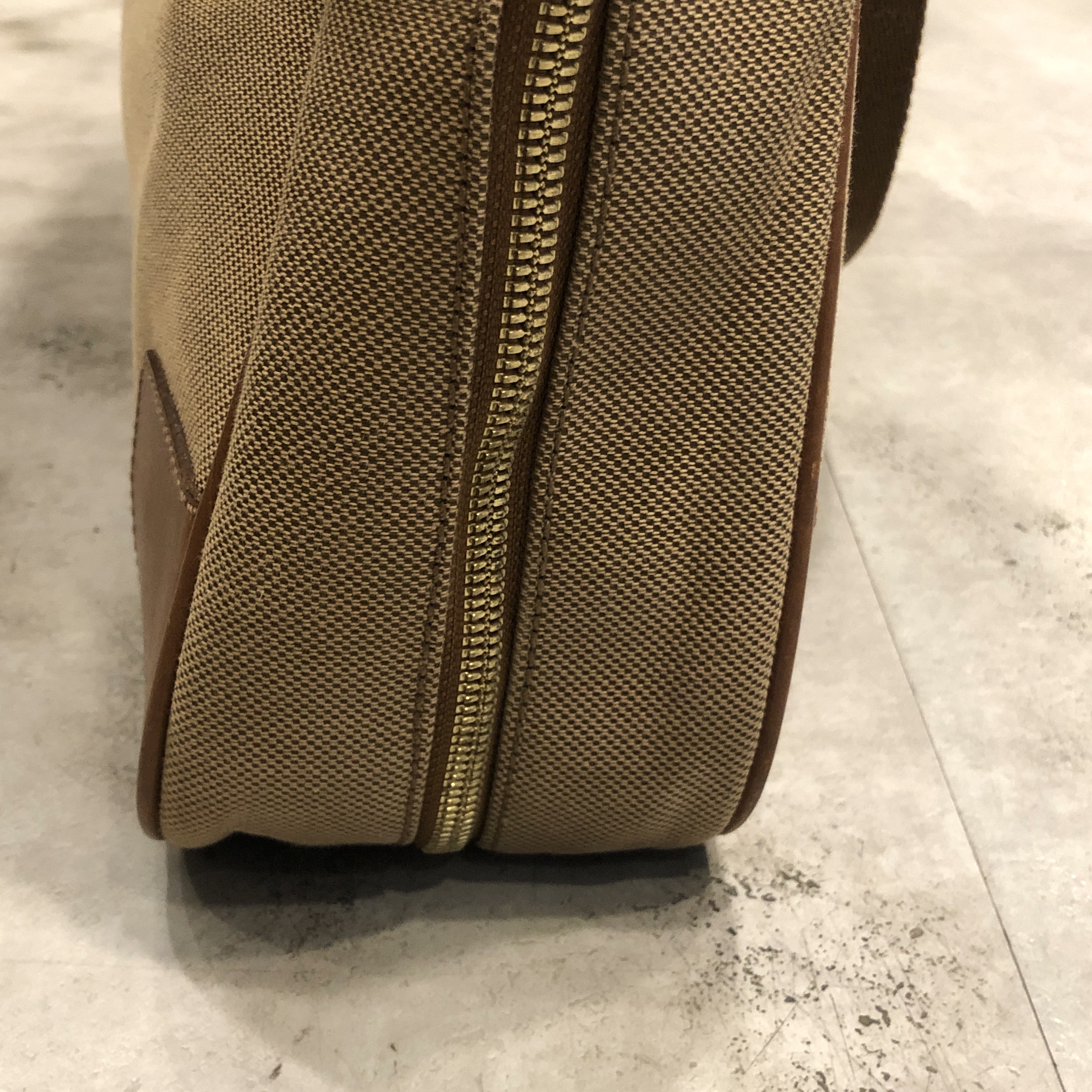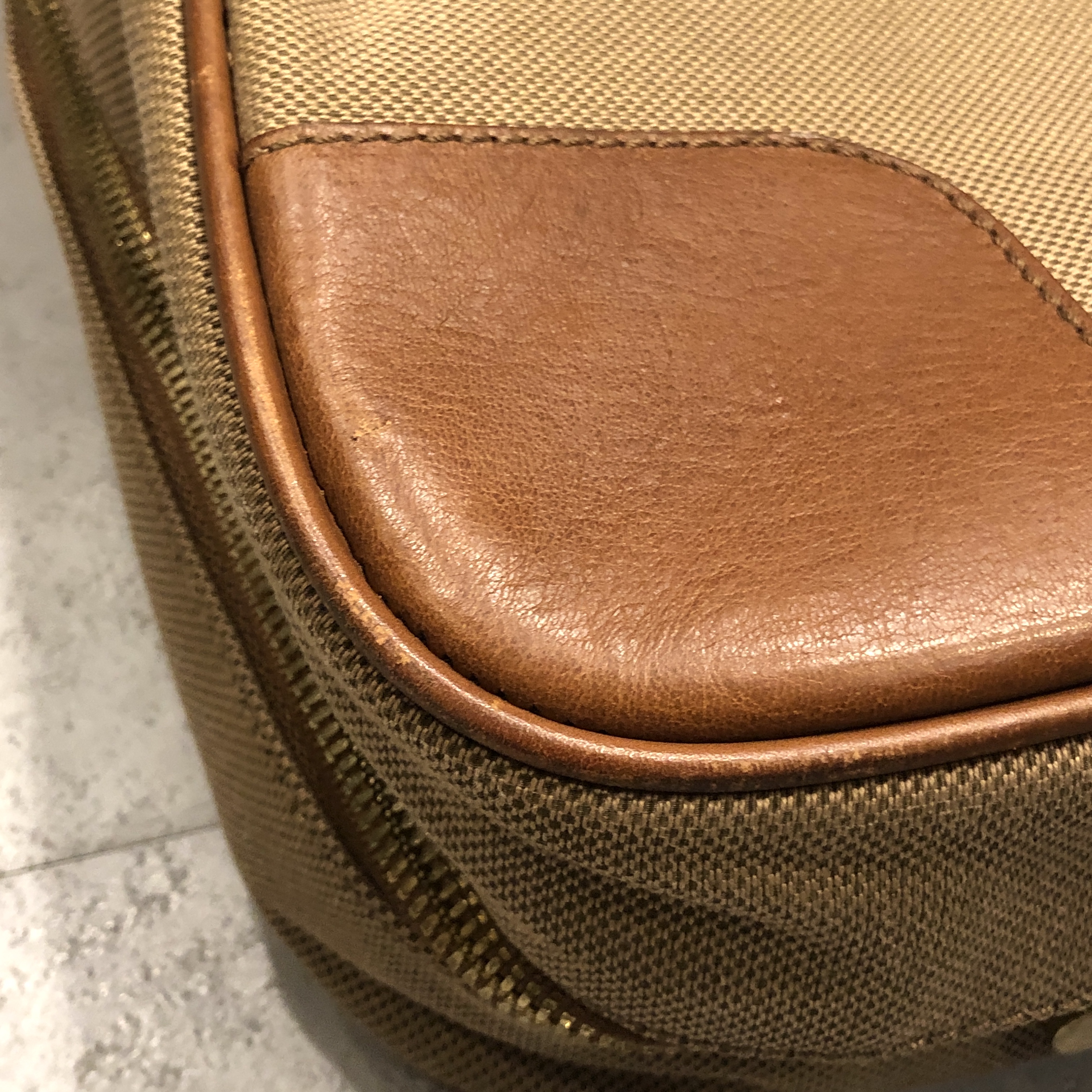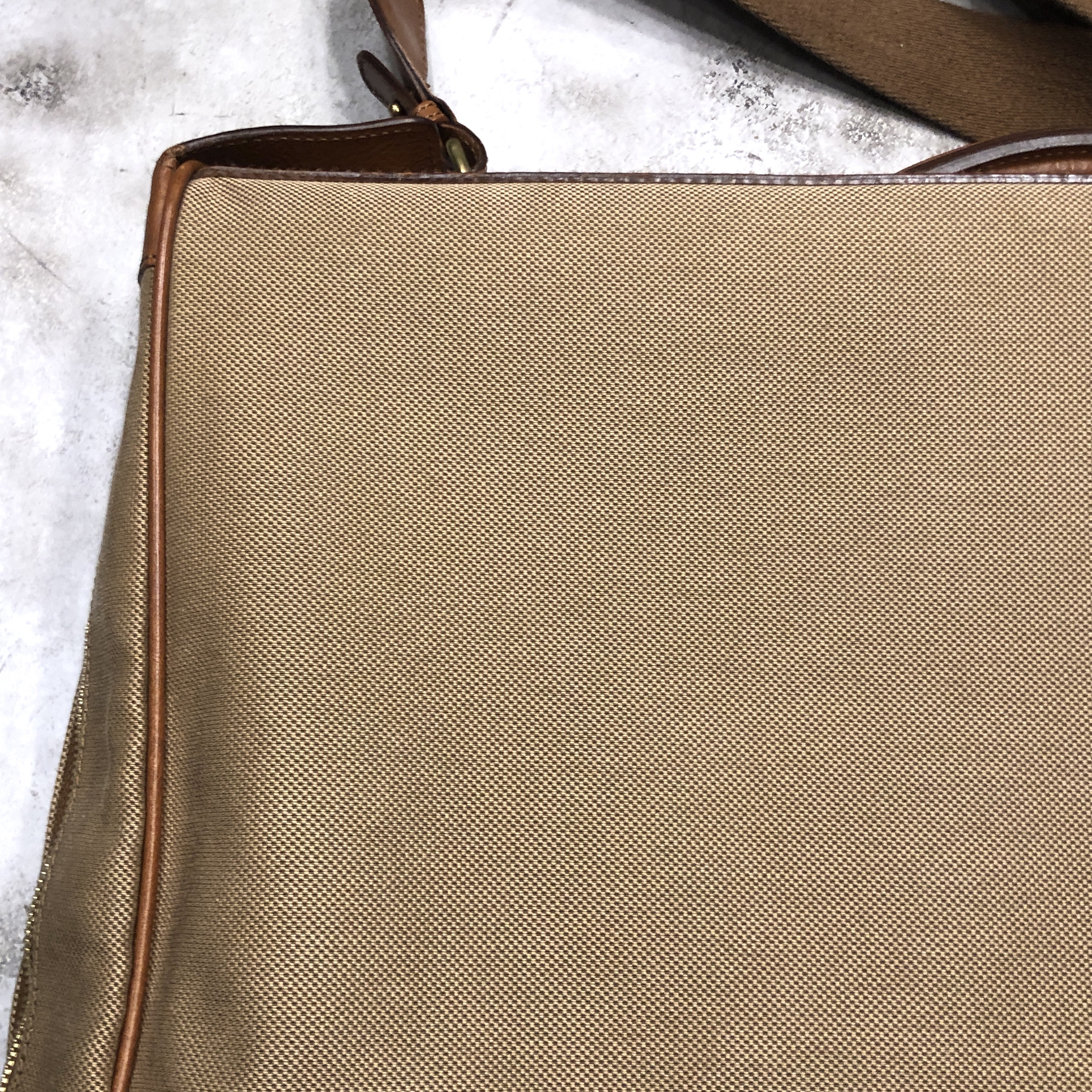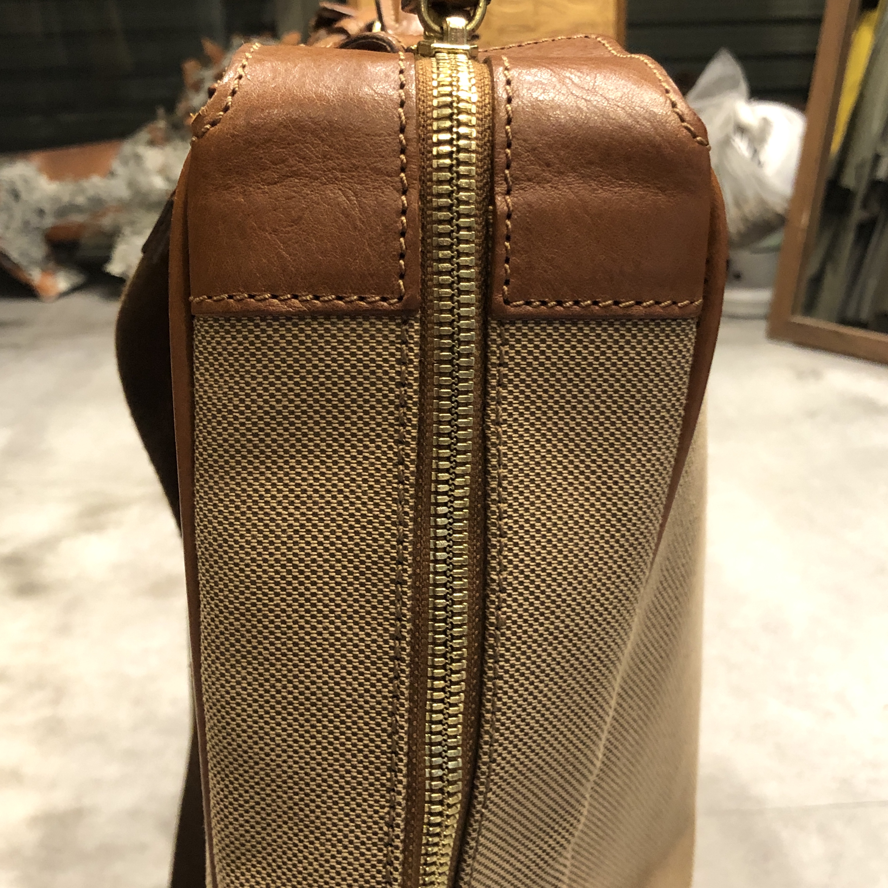 ベージュベースのボディに、ブラウンレザーのトリミング。