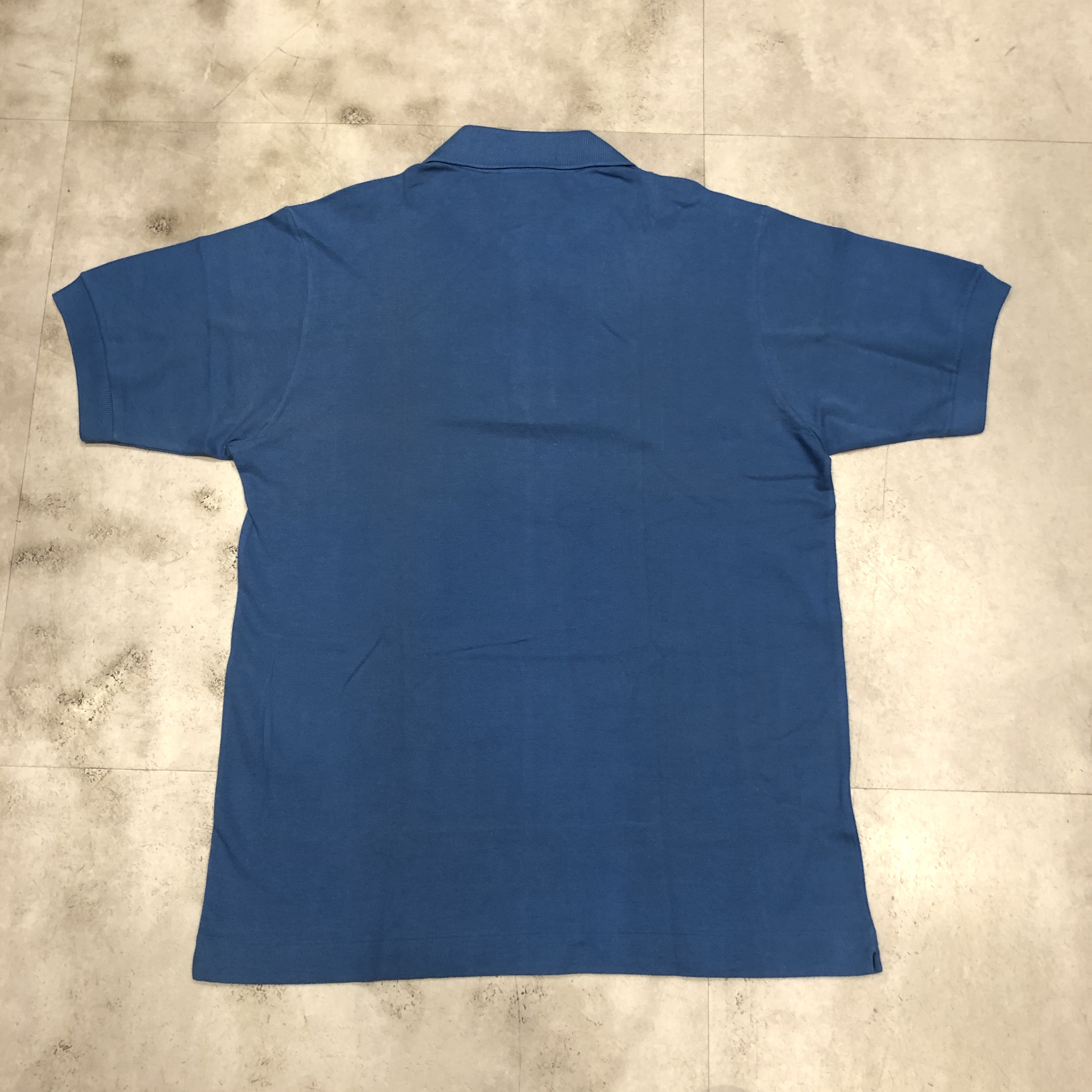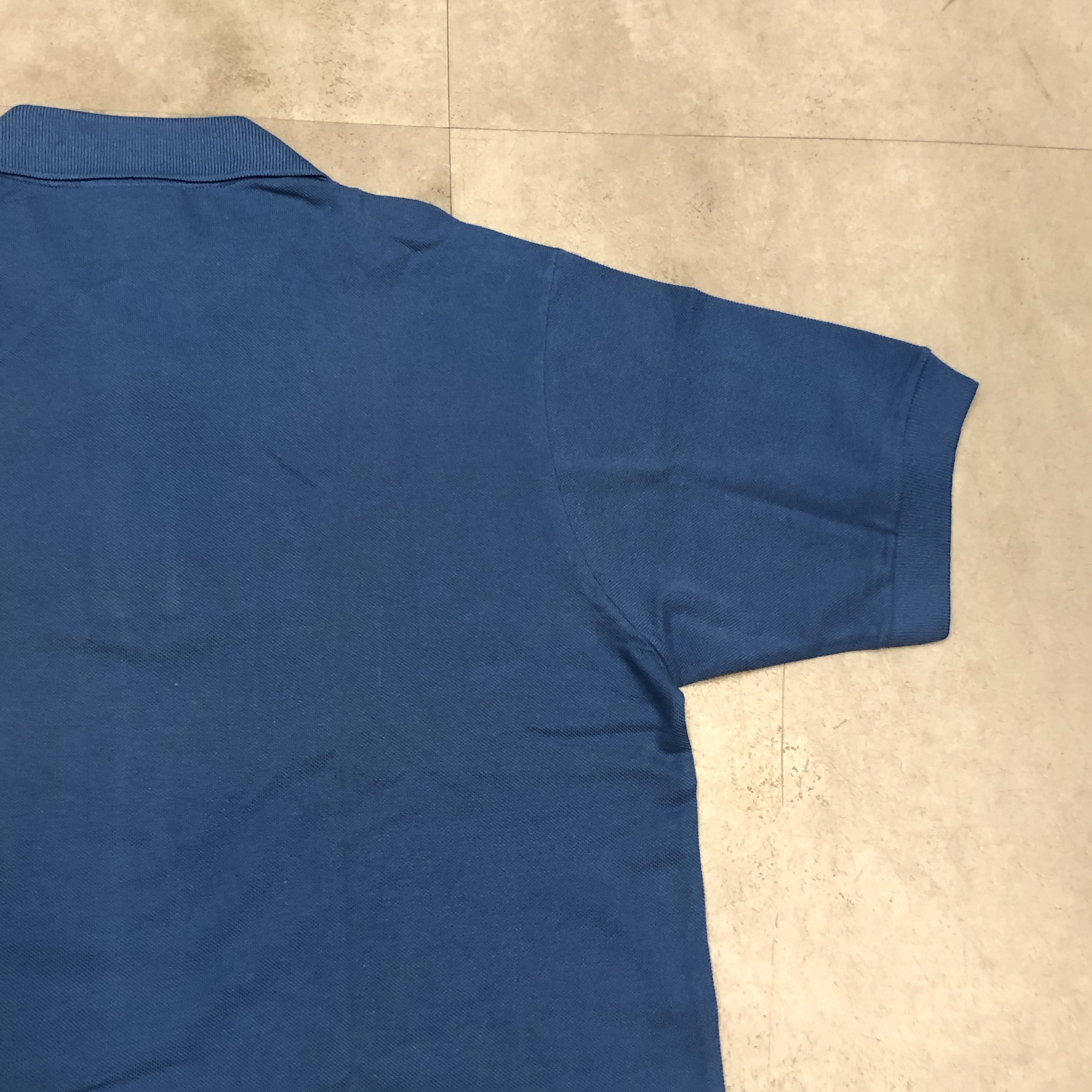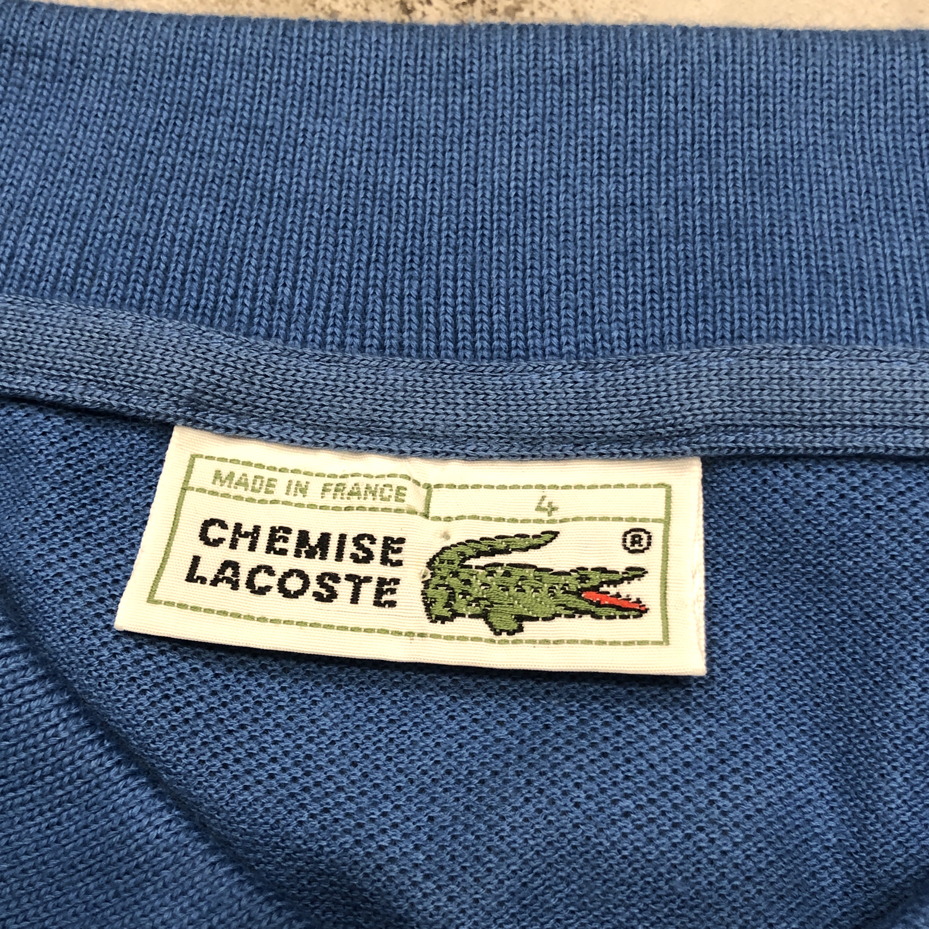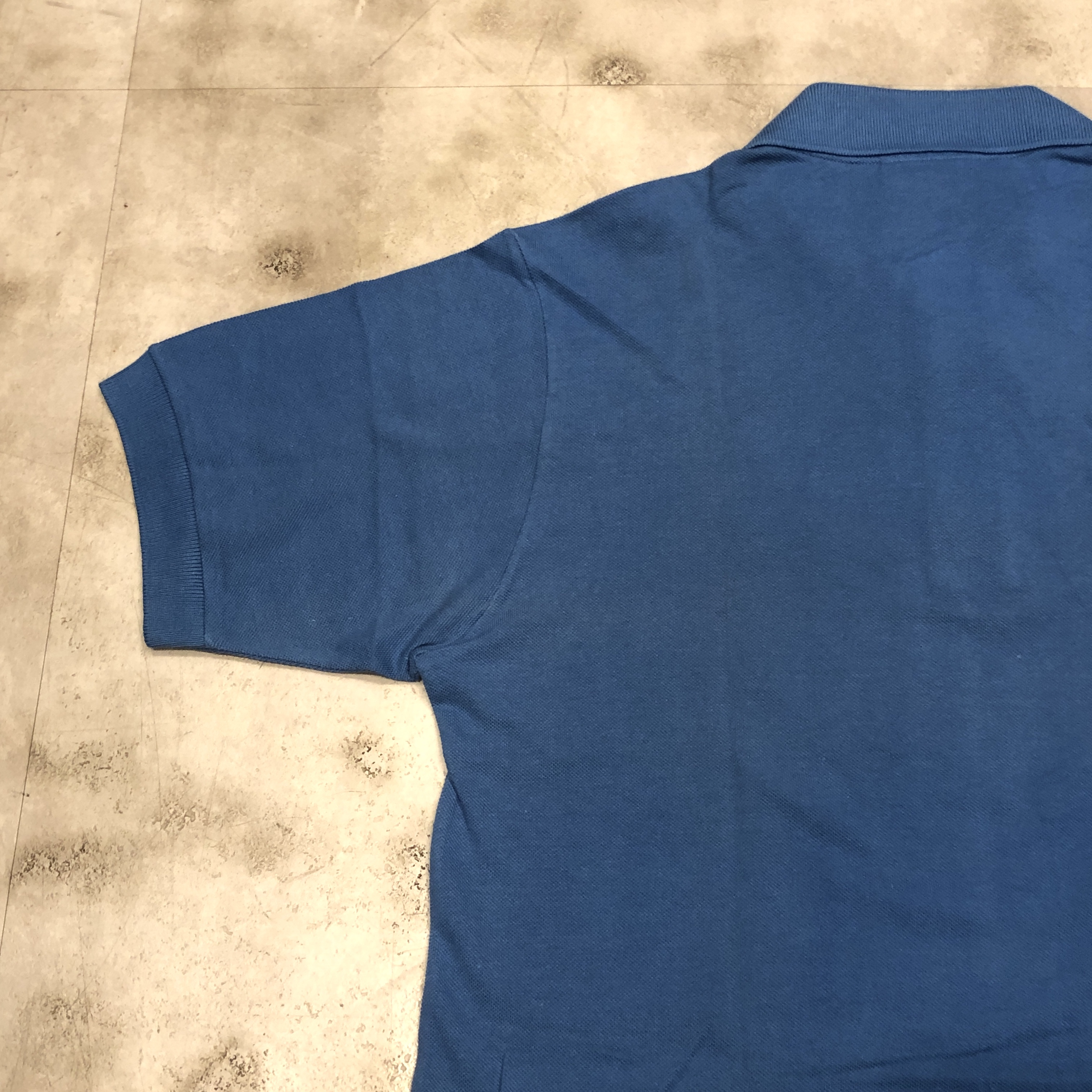 こちらはシックなブルーカラー、タグ表記“4”サイズの一着。ブランドのアイコンとも言えるワニのワッペンが胸元にしっかりと鎮座し、さりげなく存在感を放っています。