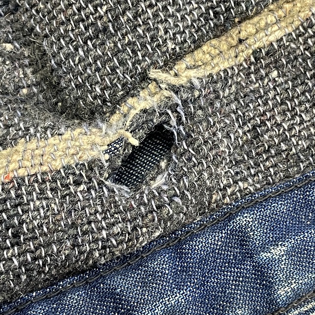 前身頃に数か所、ポケット、後左裾上付近等にリペアがございます。