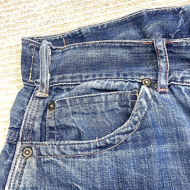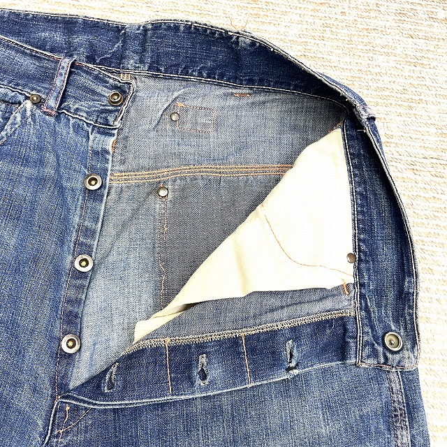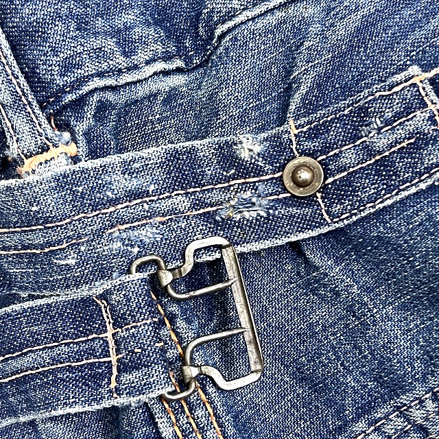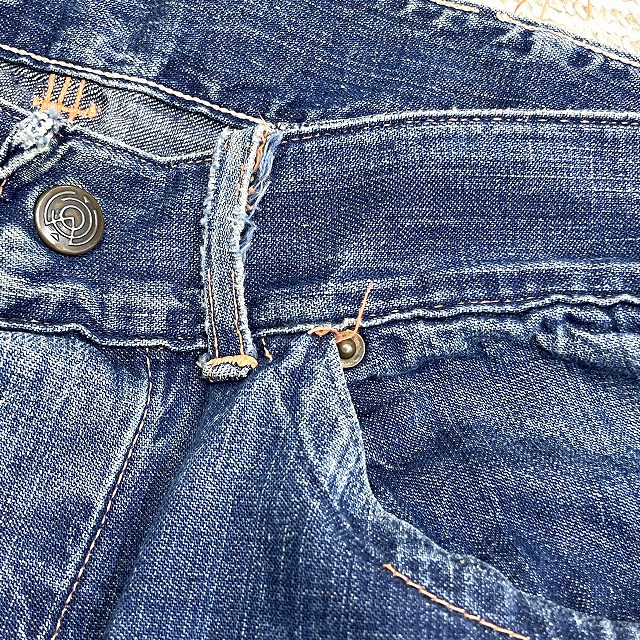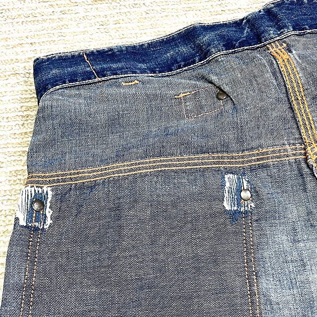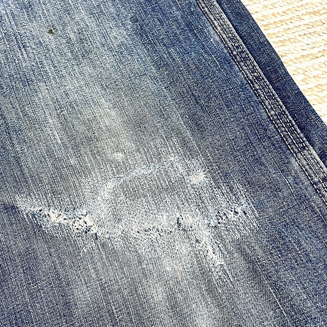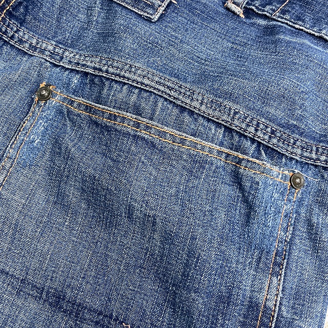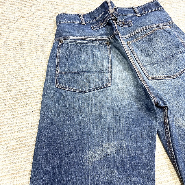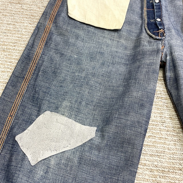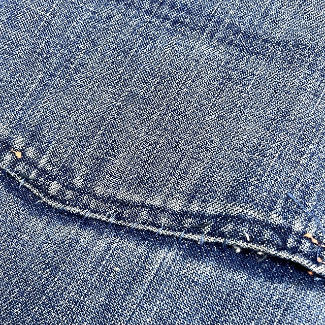 ボタンホール、ポケット、左膝付近にリペアがございます。